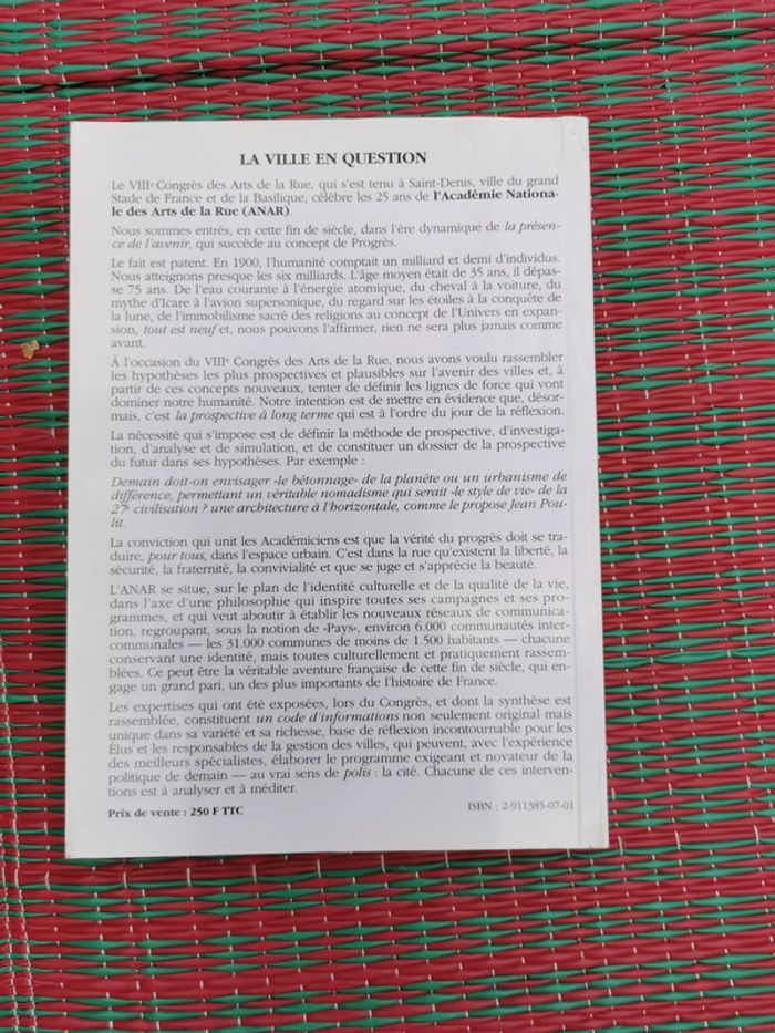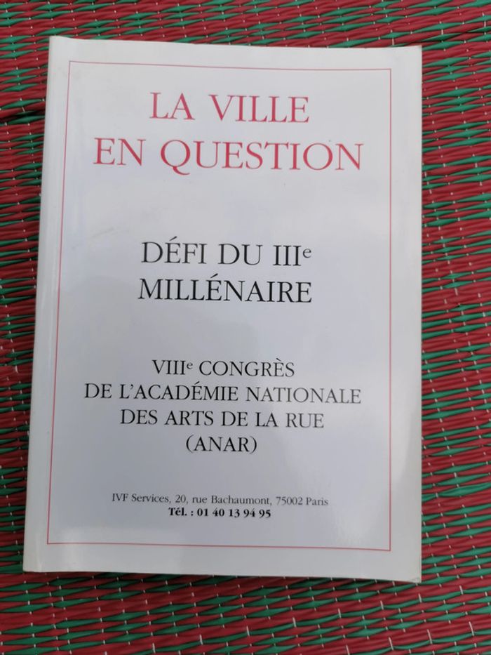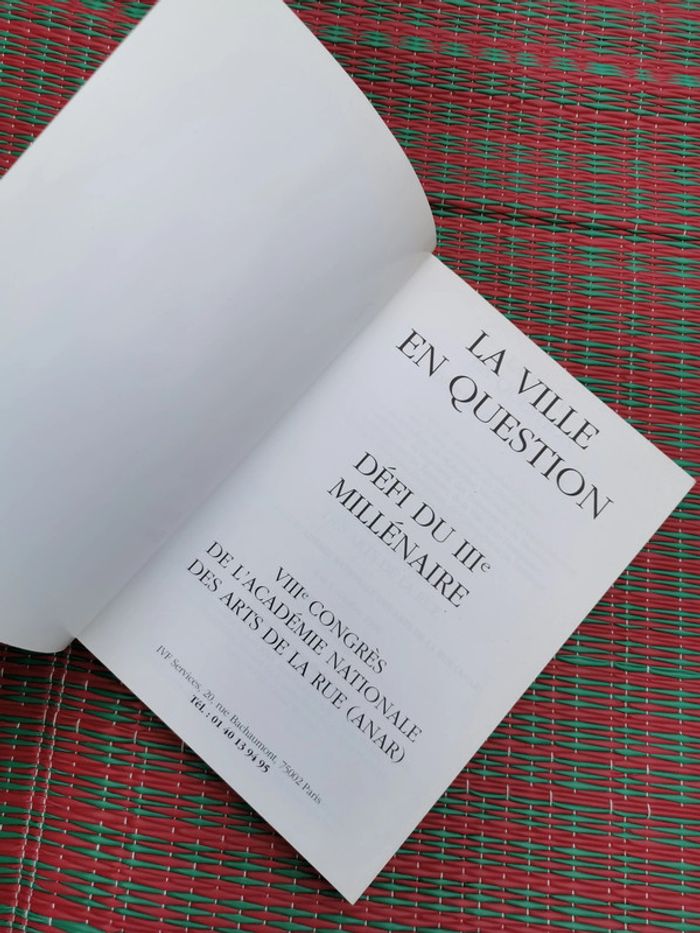 La ville en question, Défi du IIIe millénaire. VIIIe congrès de l'Académie Nationale des Arts de la rue (ANAR), imprimerie Néo-Typo, 1996, 253p., 387g. Livre est en très bon état général, tache de pluie sèche désormais, à l'angle gauche supérieur. Pensez à faire des lots afin de bénéficier des remises que j'ai régulièrement sur ma page. #lavilleenquestion #defimillenaire #congres #academienationaledesartsdelarue #anar