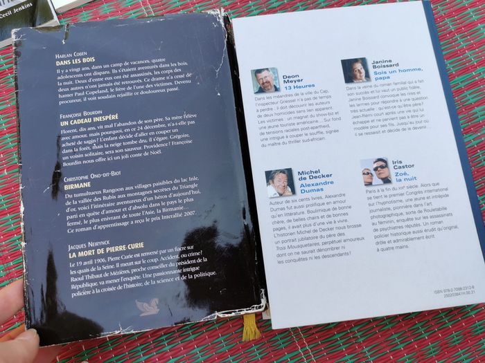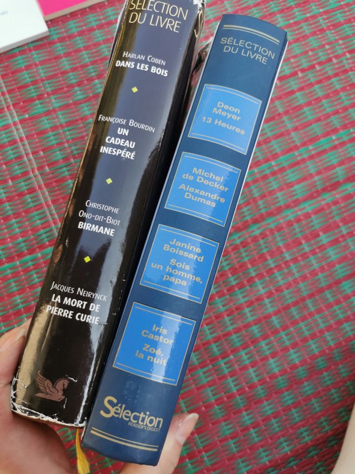 Lot de 2 livres format relié Séléction du Livre, le lot n'est pas dissociable, les livres sont en très bon état général, l'un des livres avec la jaquette marquée et le livre est jauni. Le lot comprend : 1. Livre sans jaquette comprend les textes de : - Deon Meyer, 13 heures - Michel de Decker, Alexandre Dumas - Janine Boissard, Sois un homme, papa - Iris Castor, Zoé, la nuit 590p., 2011. 2. Livre avec la jaquette comprend les textes de : - Harlan Coben, dans les bois - Françoise Bourdin, un cadeau inespéré - Christophe Ono-dit-Biot, Birmane - Jacques Neirynck, la mort de Pierre Curie 590p., 2008. Poids du lot 1,2kg #selectiondulivre #harlancoben #alexandredumas #janineboissard #francoisebourdin #christopheonoditbiot