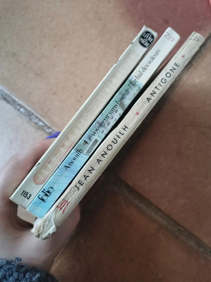Lot de livres de Jean Anouilh, peut être vendu à l'unité, les prix sont affichés dans l'annonce pour le lot et dans la déscription pour chacun des livres, le lot comprend : - Livre de Jean Anouilh, Antigone, 133 p., 1947, éd. La Table Ronde, 107g. Couverture souple bon état général compte tenu son ancienneté. RARE. Prix 30€ - Livre de poche de Jean Anouilh, l'Alouette, 181 p, 1963, 133 g. Bon état, pages jaunies, à la fin du livre traces au stylo. Prix 2€ - Livre de poche, folio, de Jean Anouilh, le Voyageur sans bagage suivi de le Bal des voleurs, 1972, 218 p., 139g. En très bon état, une petite tache au feutre rose et les pages ont un peu jaunies avec le temps. Prix 3€ Poids du lot 378g #jeananoulih #livresdepoche #livresanciens #vieuxlivre #folio #theatre