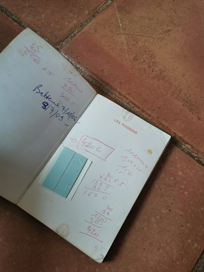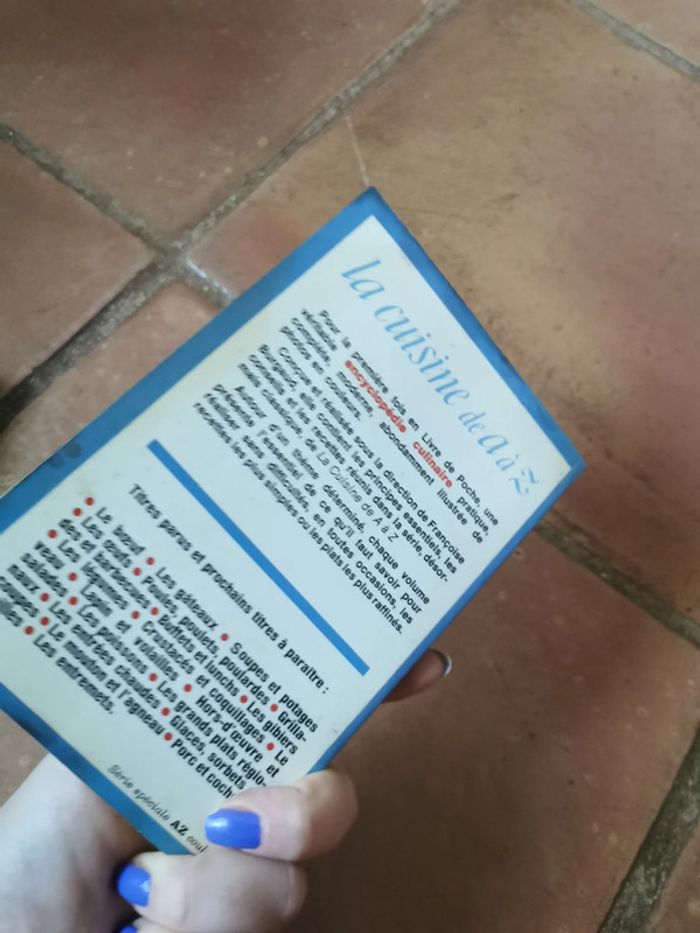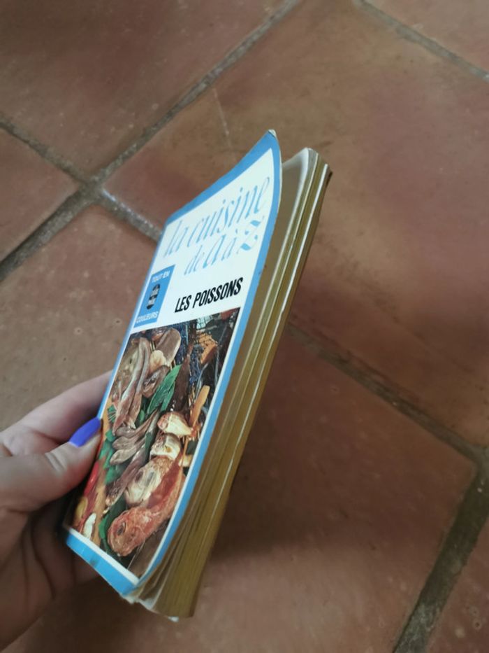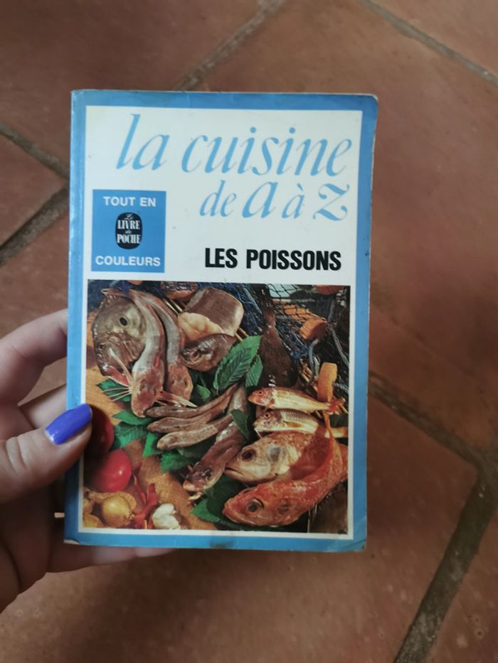 La cuisine de A à Z poissons, livre de poche, 1975, tout en couleurs, 191 p., 171 g. Le livre est désassemblé, des écritures. #lacuisinedeaaz #livredepoche #cuisineenphotos