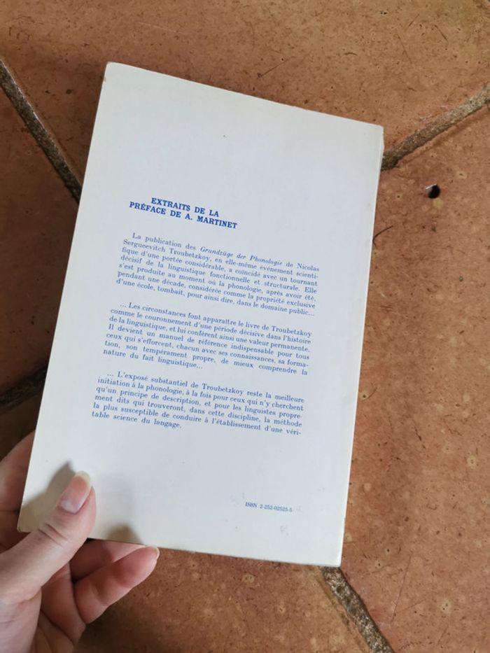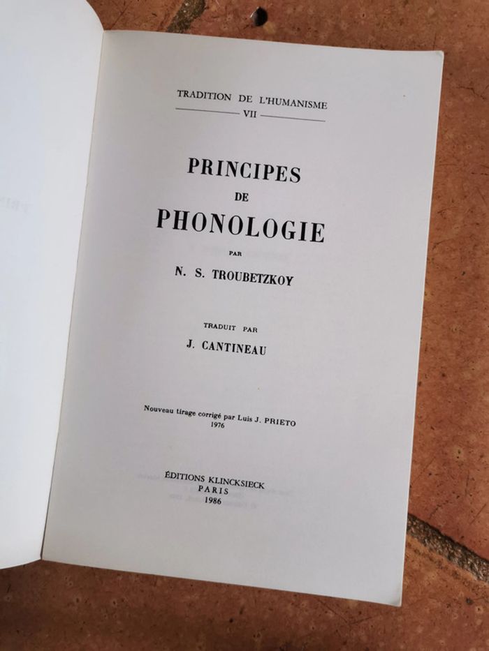 Principes de Phonologie par N.S. Troubetzkoy. Tradition de l'Humanisme, éd. Klincksieck, 1986, 396 p., 665 g. Livre grand format relié, couverture souple, en bon état, les taches de jaunissement sur la tranche et la couverture. #principesdephonologie #troubetzkoy #traditiondelhumanisme