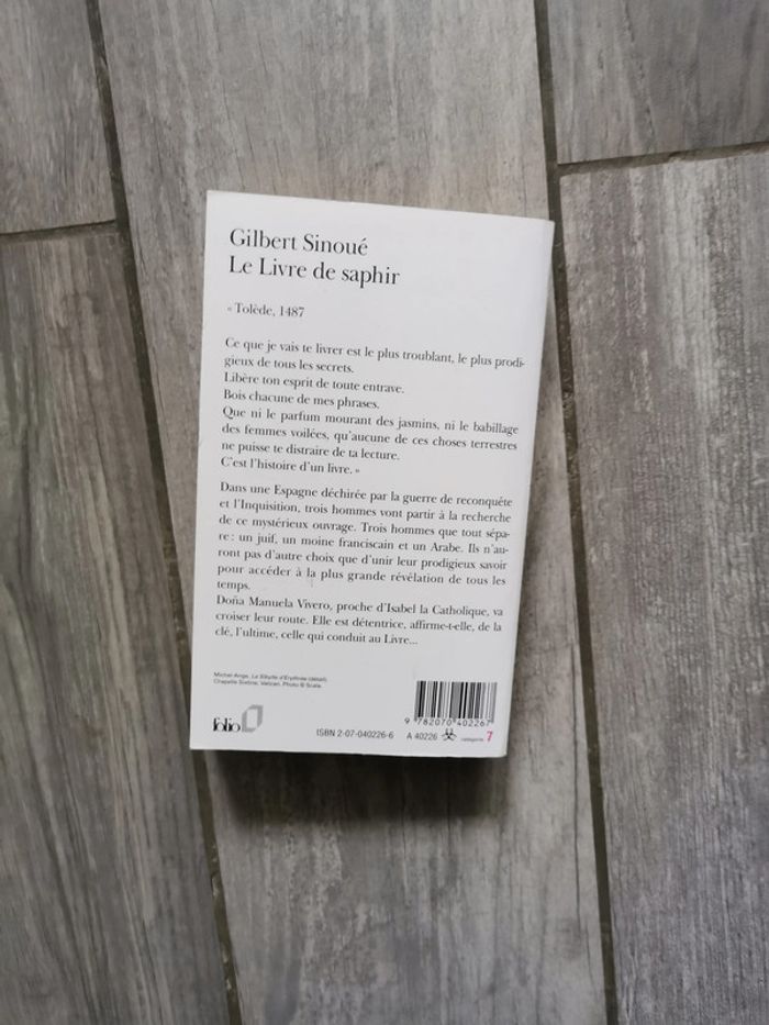 Le livre de saphir, Gilbert Sinoué, livre de poche, éd. Folio, 1997, 660 p., 346 g. Le livre est neuf, mais marqué sur la tranche et quelques coins de pages ont été pliés. #lelivredesaphir #gilbertsinoue #folio #livredepoche