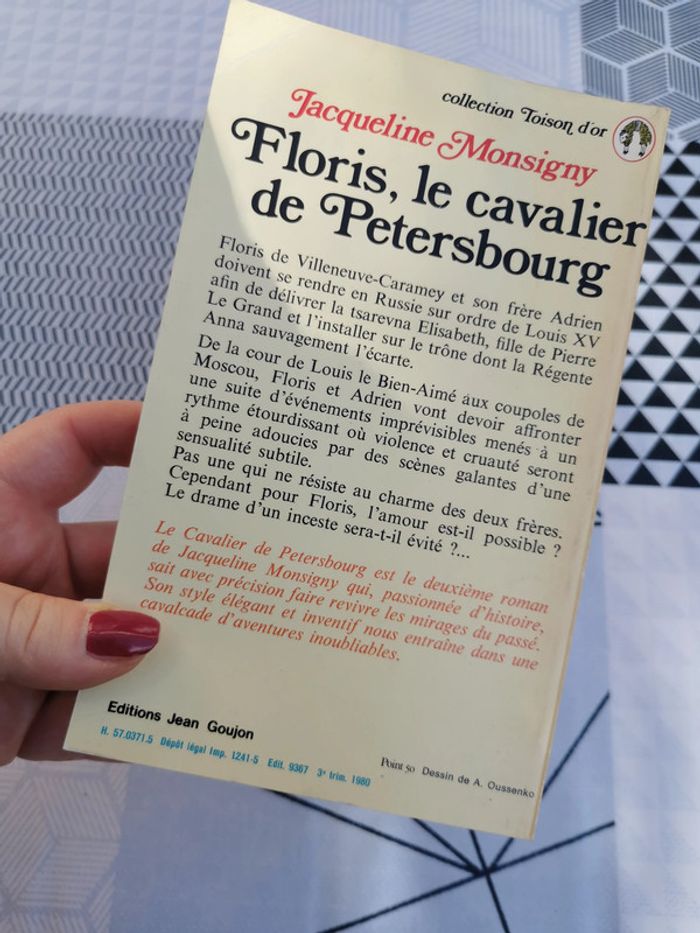 Floris, le cavalier de Petersbourg, livre de Jacqueline Monsigny, collection Toison d'or, éd. Jean Goujon, imprimé en France, 1980, 443 p., 228 g. Livre neuf, un peu jaunit par le temps et le bas de la couverture est un peu marqué. #florislecavalier #letoisondor #petersbourg #livredepoche #livrevintage #jacquelinemonsigny #livreneuf