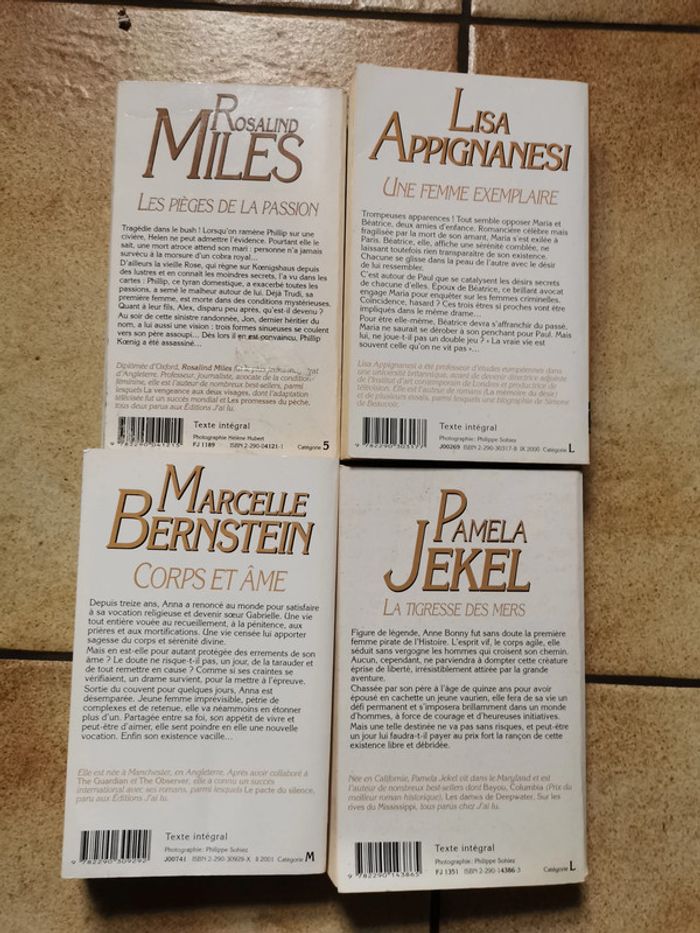 Lot de 4 romans livres de poche J'ai lu, les livres sont en bon état général, comportent des jaunissements, certaines couvertures sont un peu plus marquées que d'autres, les livres des années 1990/2000. Aux éditions J'ai lu, collection Roman, le lot n'est pas dissociable, son poids fait 860 g. Le lot comprends : 1. Les Pièces de la passion, Rosalind Miles, 1998, 382 p. 2. Une femme exemplaire, Lisa Appignanesi, 2000, 477 p. 3. Corps et Ame, Marcelle Bernstein, 2001, 510 p. 4. La Tigresse des mers, Pamela Jekel, 1999, 441 p. #lotdelivres #lotderomans #livresvintage #livredepoche #jailu