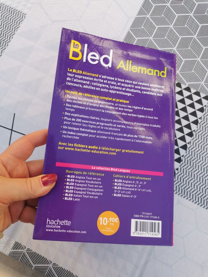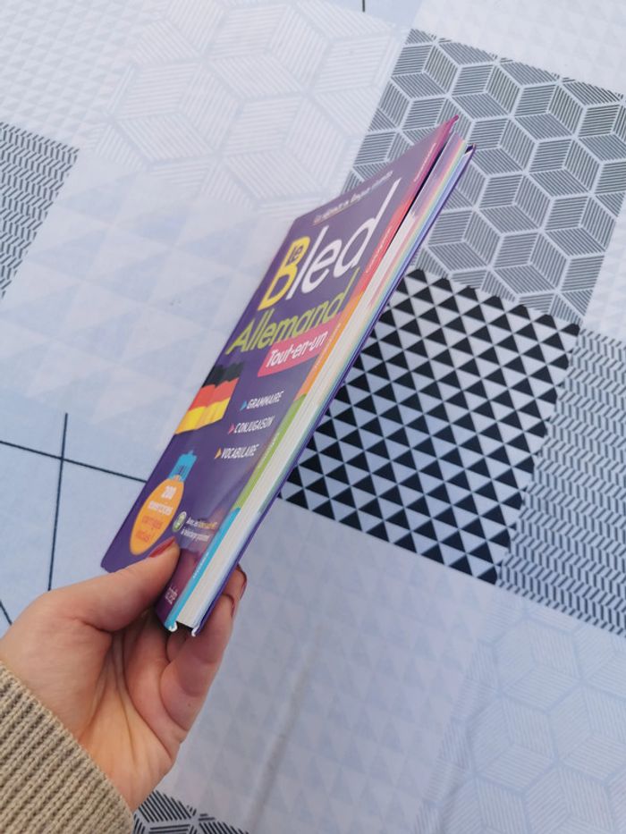 Le bled Allemand Tout-en-un. La référence en langues vivantes, éd. Hachette éducation, Marie Marhuenda et Bernard Viselthier, 2014, 189p., 327 g. le livre est comme neuf, dans la coucverture souple, a pris un peu l'eau sur le bas des dernières pages, mais sec, aucune odeur et ce n'est pas très visible, une pliure sur la couverture. #allemand #apprendreallemand #lebled #lebledallemand #grammaireallemand #allemandgrammaire