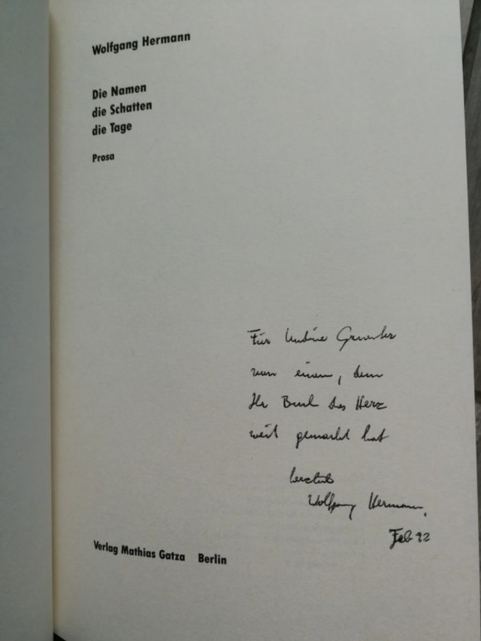 Die Namen die Schatten die Tage, Wolfgang Hermann, livre en ALLEMAND, éd. Gatza, Berlin, 1991, 123 p., 215 g. Livre au format semi brochet, dans la couverture souple, en très bon état général, comportant de légérs marques sur le tour de la couverture. Le livre est rare et est dédicacé ! #poesieallemande #livreenallemand #allemand #wolfganghermann #livrerare #livrededicace