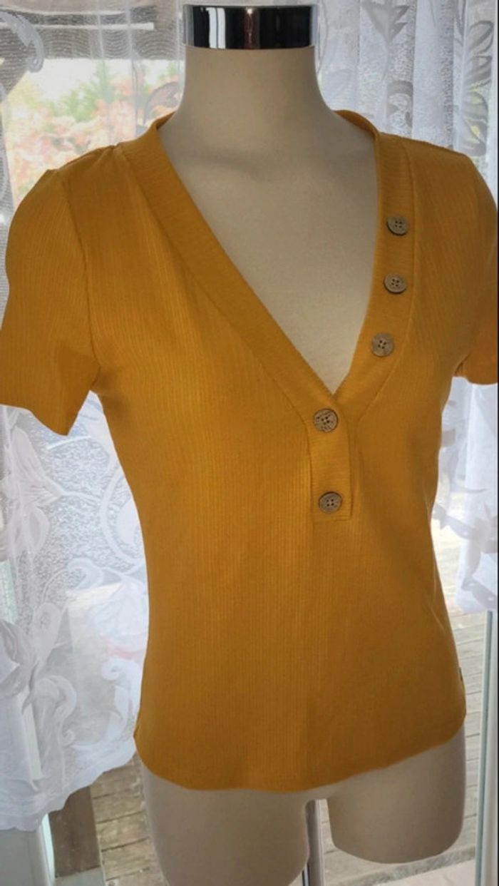 Haut moutarde à manches courtes avec encolure en V – Style et confort réunis - photo numéro 1