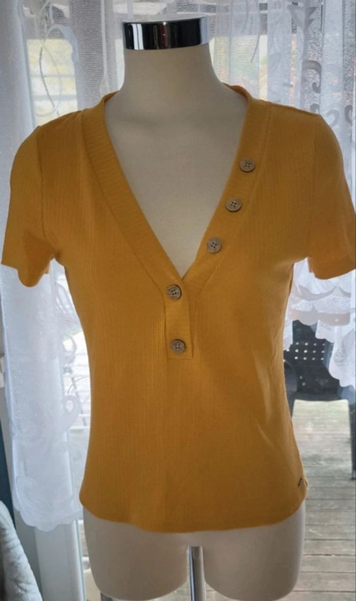 ✨ **Description** : Ajoutez une touche de soleil à votre garde-robe avec ce haut lumineux ! Sa jolie coupe à manches courtes et son encolure en V avec quatre boutons offrent un style décontracté idéal pour le quotidien. En très bon état, ce haut est prêt à apporter de la couleur et du confort à vos tenues. 📏 **Taille** : 38 💥 **État** : Très bon état #a2life_taille38