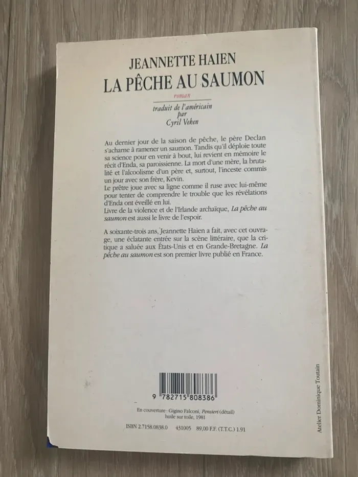 Je vends ce roman "La pêche au saumon" de Jeannette Haien, traduit de l'américain. - Titre : La pêche au saumon - Auteur : Jeannette Haien - Genre : Roman - Traducteur : Cyril Veken Bon état (tâche noir sur le coin en bas du livre) N'hésitez pas à me contacter pour plus d'informations ! #benjinantes