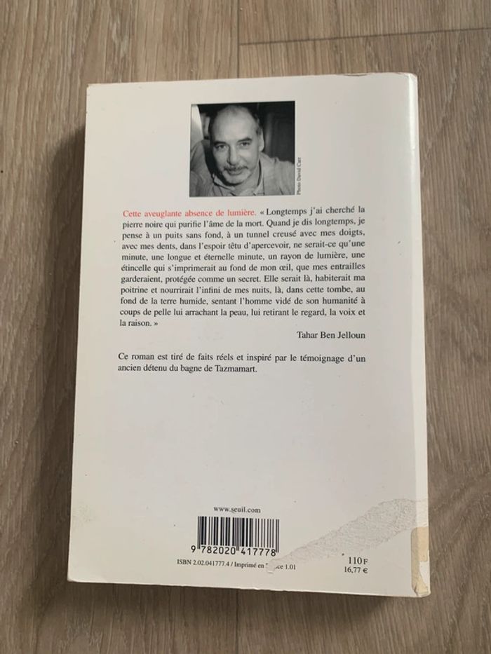 Cette aveuglante absence de lumière. " Longtemps j'ai cherché la pierre noire qui purifie l'âme de la mort. Quand je dis longtemps, je pense à un puits sans fond, à un tunnel creusé avec mes doigts, avec mes dents, dans l'espoir têtu d'apercevoir, ne serait-ce qu'une minute, une longue et éternelle minute, un rayon de lumière, une étincelle qui s'imprimerait au fond de mon œil, que mes entrailles garderaient, protégée comme un secret. Elle serait là, habiterait ma poitrine et nourrirait l'infini de mes nuits, là, dans cette tombe, au fond de la terre humide, sentant l'homme vidé de son humanité à coups de pelle lui arrachant la peau, lui retirant le regard, la voix et la raison. " Tahar Ben Jelloun Ce roman est tiré de faits réels et inspiré par le témoignage d'un ancien détenu du bagne de Tazmamart. #benjinantes