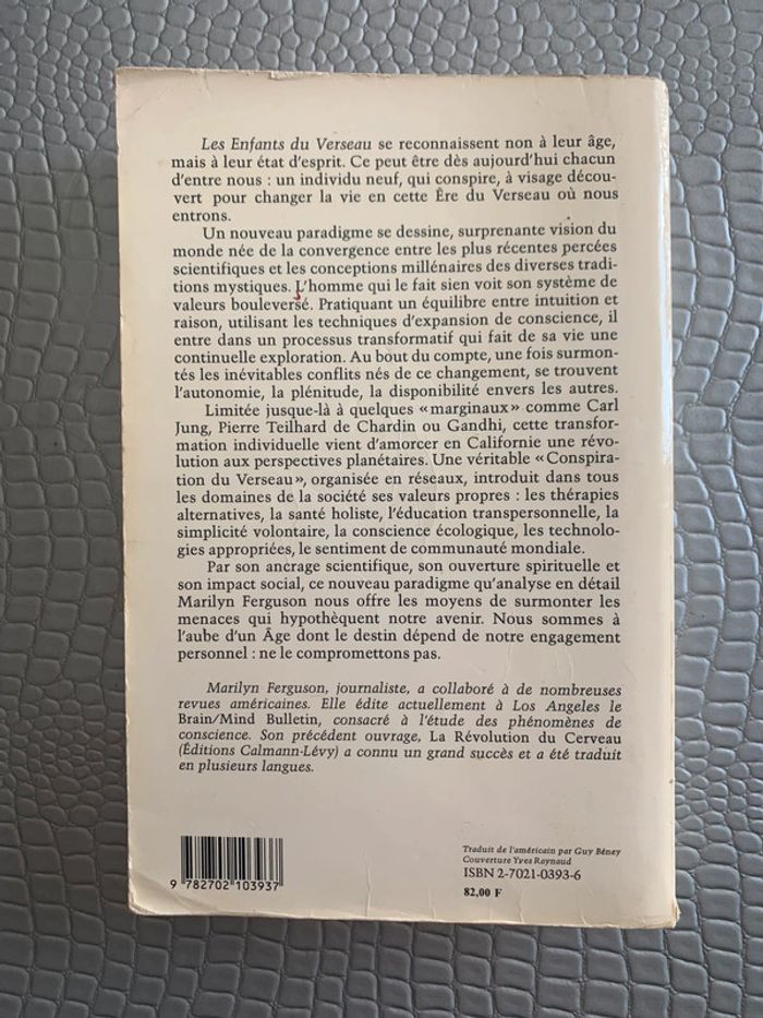 📘 Les Enfants du Verseau – Marilyn Ferguson Plongez dans un ouvrage visionnaire qui explore l’émergence d’un nouveau paradigme spirituel, scientifique et social. Les Enfants du Verseau de Marilyn Ferguson décrit l’avènement d’un individu nouveau, porteur de transformation personnelle et collective. Un livre culte qui mêle psychologie, traditions mystiques, sciences humaines et mouvements alternatifs, avec une perspective novatrice sur l’évolution de la conscience. 🔹 Auteur : Marilyn Ferguson 🔹 Éditeur : Éditions Calmann-Lévy 🔹 Langue : Français 🔹 ISBN : 2-7021-0393-6 🔹 Prix d’origine : 82,00 F 🔹 État : Bon état (quelques traces d’usure sur la couverture) Parfait pour les passionnés de développement personnel, de spiritualité, ou d’alternatives à la pensée dominante. #benjinantes