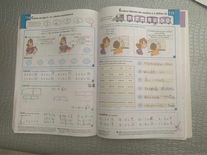 Des choix pédagogiques largement confortés par la recherche en psychologie cognitive du nombre et par la pratique des enseignants. J'apprends les maths CP avec Picbille fait de l'accès au calcul mental un objectif prioritaire. Il s'agit, dès ce niveau de la scolarité, de prévenir chez les élèves tout risque d'enfermement dans le comptage un à un. C'est pourquoi les choix pédagogiques qui ont fait le succès des éditions antérieures se retrouvent dans celle-ci : distinguer entre comptage et calcul ; favoriser l'accès au calcul mental en s'appuyant sur les repères 5 et 10 ; enseigner dès le CP les différentes stratégies de calcul d'une soustraction. Cinq sortes de nouveautés prenant en compte les recherches récentes et l'expérience des utilisateurs sont introduites dans cette édition : une place accrue est faite aux situations-problèmes d'anticipation ; l'introduction d'un nouveau mode de représentation des nombres, basé sur leur organisation par paires (les " nombres comme Perrine "). Celui-ci favorise d'autres stratégies et permet donc une plus grande souplesse de calcul. Il conduit aussi à une meilleure compréhension du groupement par 10 ; l'étude des groupements par 2 et par 5 avant d'aborder le groupement par 10 facilite l'enseignement de la numération décimale et, de plus, prépare à l'étude de la multiplication et de la division dans les classes ultérieures ; une meilleure progressivité dans l'étude de la soustraction. En l’état, écritures au crayon de bois à l’intérieur #benjinantes