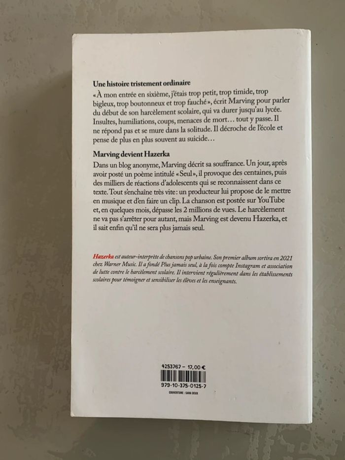 Une histoire tristement ordinaire" À mon entrée en sixième, j'étais trop petit, trop timide, trop bigleux, trop boutonneux et trop fauché ", écrit Marving pour parler du début de son harcèlement scolaire, qui va durer jusqu'au lycée. Insultes, humiliations, coups, menaces de mort... tout y passe. Il ne répond pas et se mure dans la solitude. Il décroche de l'école et pense de plus en plus souvent au suicide... Marving devient HazerkaDans un blog anonyme, Marving décrit sa souffrance. Un jour, après avoir posté un poème intitulé " Seul ", il provoque des centaines, puis des milliers de réactions d'adolescents qui se reconnaissent dans ce texte. Tout s'enchaîne très vite : un producteur lui propose de le mettre en musique et d'en faire un clip. La chanson est postée sur YouTube et, en quelques mois, dépasse les 2 millions de vues. Le harcèlement ne va pas s'arrêter pour autant, mais Marving est devenu Hazerka, et il sait enfin qu'il ne sera plus jamais seul. Hazerka est auteur-interprète de chansons pop urbaine. Son premier album sortira en 2021 chez Warner Music. Il a fondé Plus jamais seul, à la fois compte Instagram et association de lutte contre le harcèlement scolaire. Il intervient régulièrement dans les établissements scolaires pour témoigner et sensibiliser les élèves et les enseignants