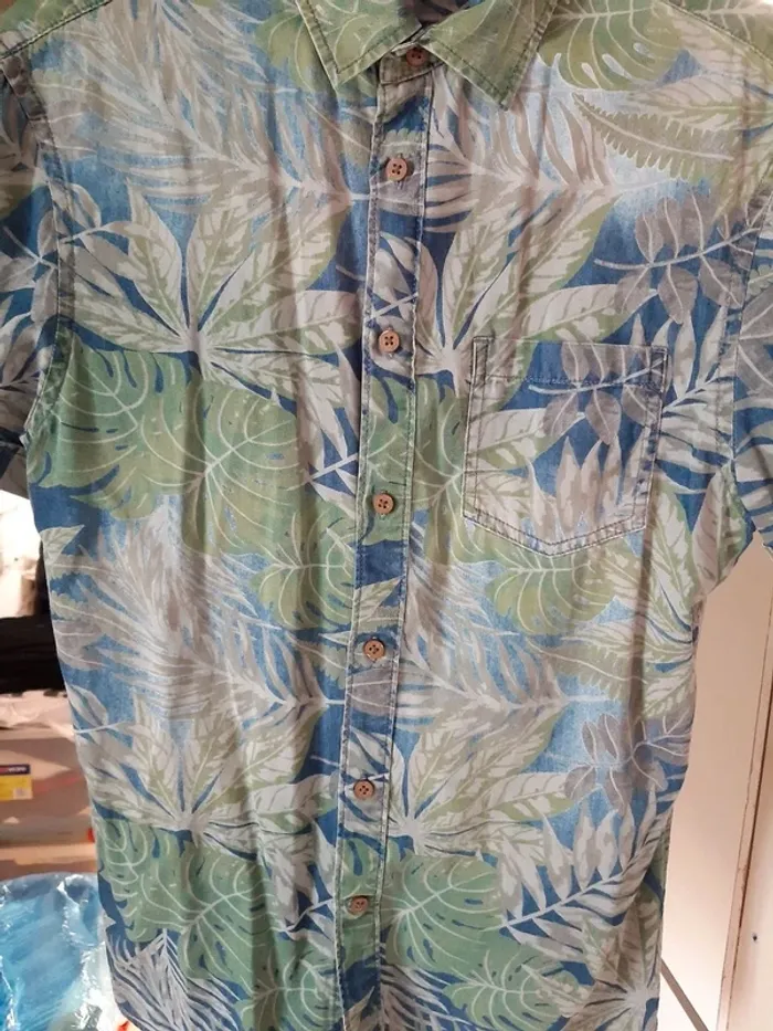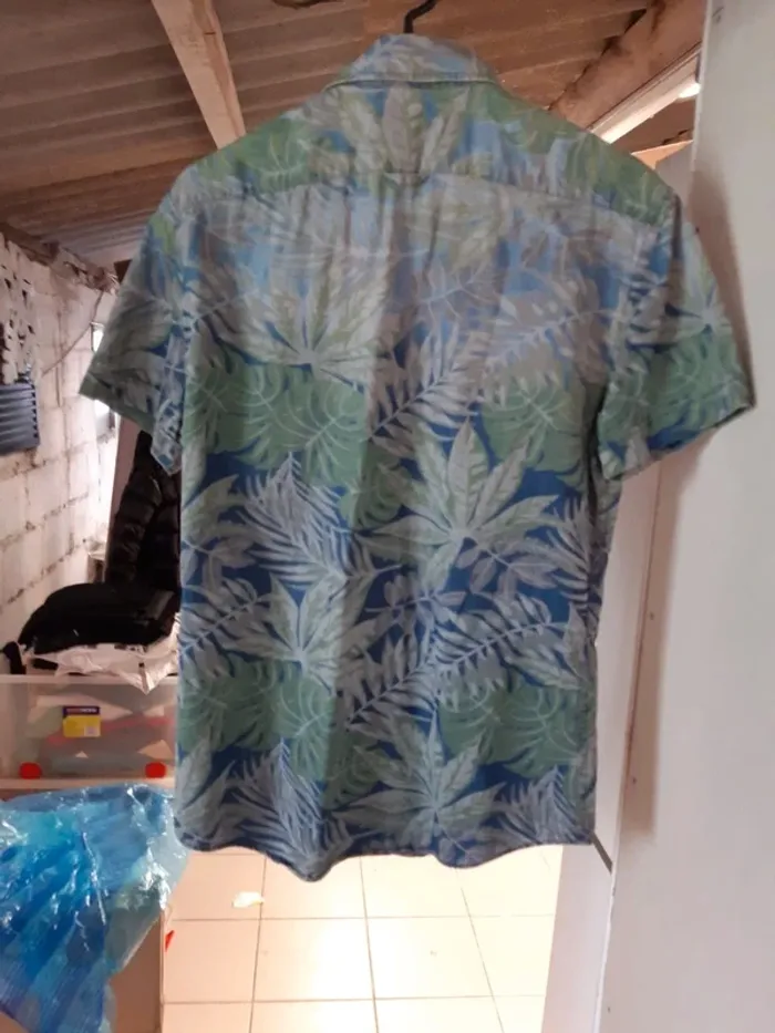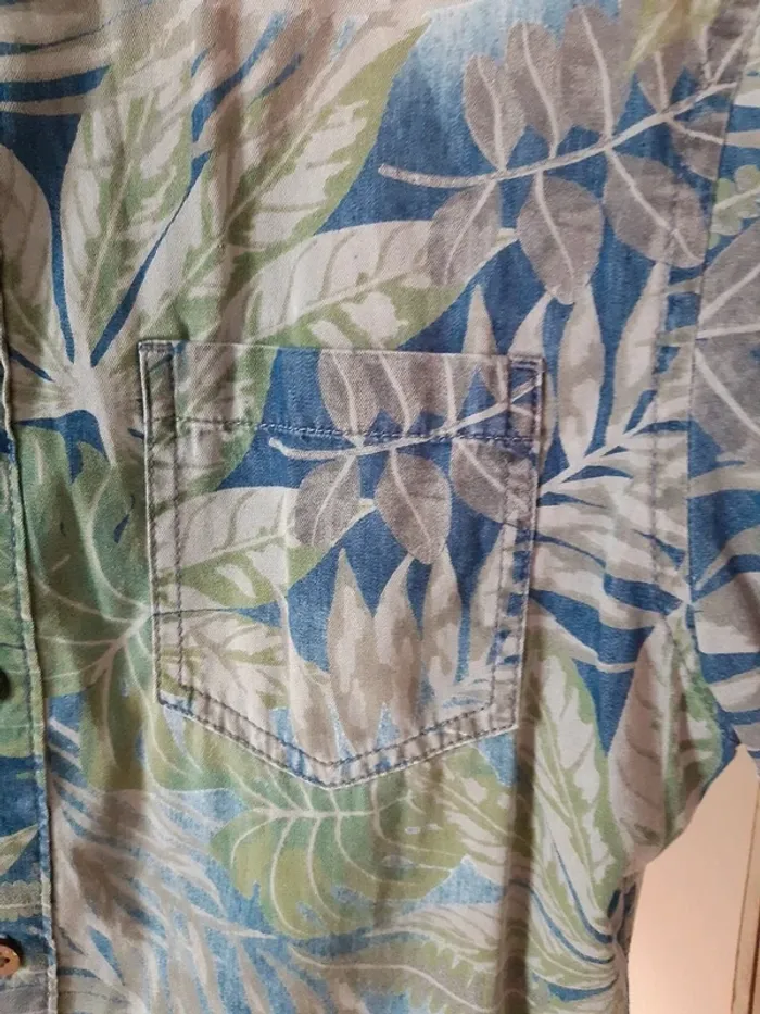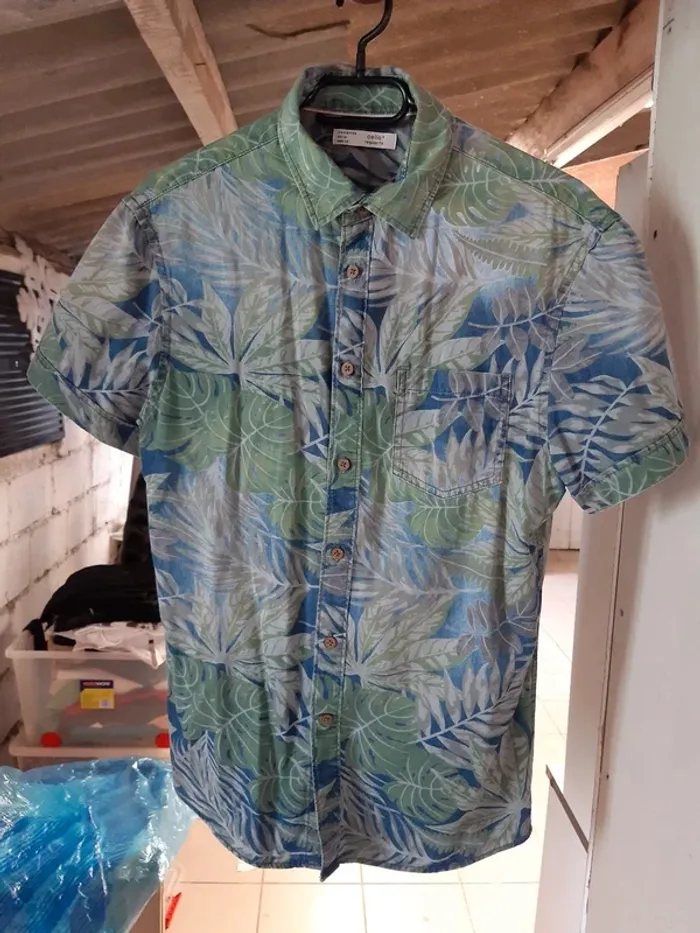 Jolie chemisette imprimée à feuilles 🍃 de couleur bleu, vert et beige. Il y a un bouton de secour (voir photo 4). Marque Celio. Taille 36. Matière coton. Mesures : épaules à épaules 45cm, longueur 71cm et aisselle à aisselle 50cm. N'hésitez pas à demander de plus amples informations.