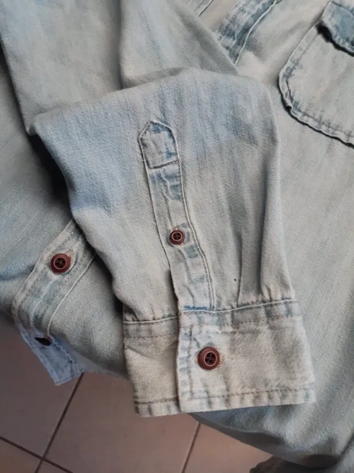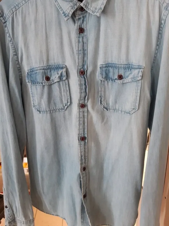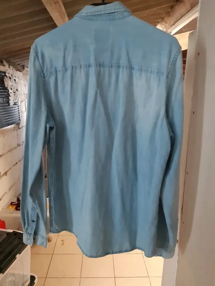 Jolie chemise en jean's de couleur bleu ciel, blanc (se fier à la 2ème photo pour la couleur), coupe droite. Neuf, sans étiquette 🏷. Marque Clock House. Taille 36. Matière 100% coton. Mesures : épaules à épaules 44cm, longueur 73cm et aisselle à aisselle 51cm. N'hésitez pas à demander de plus amples informations.