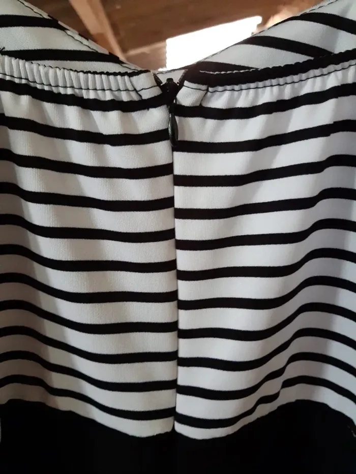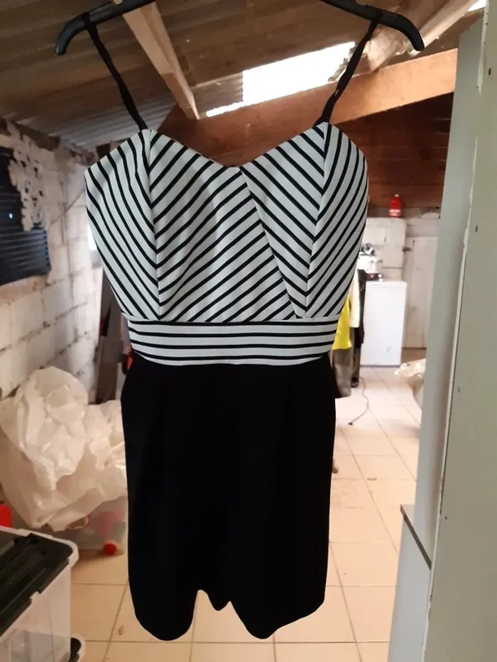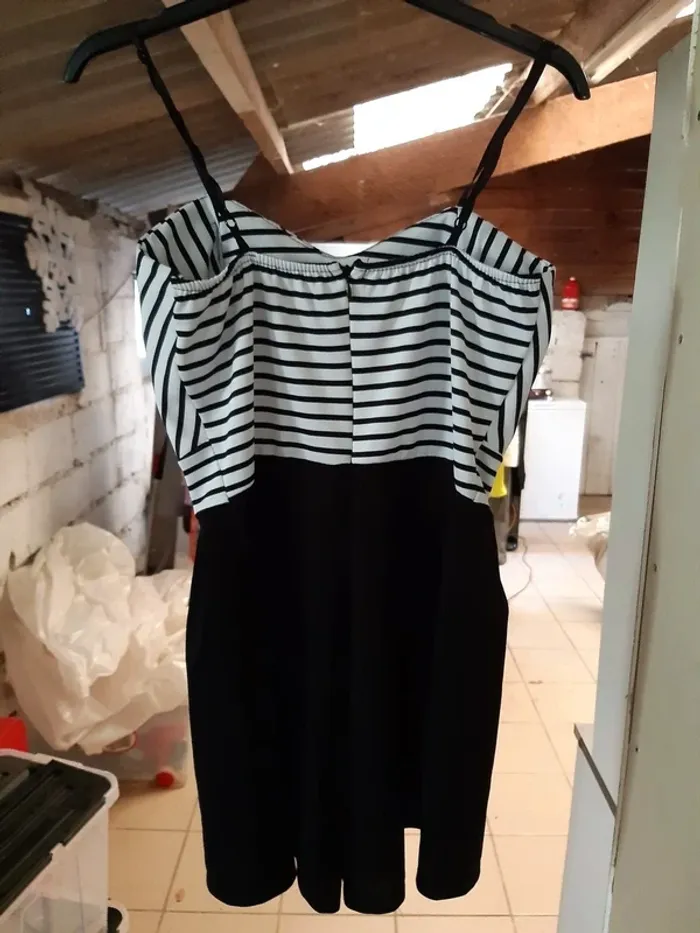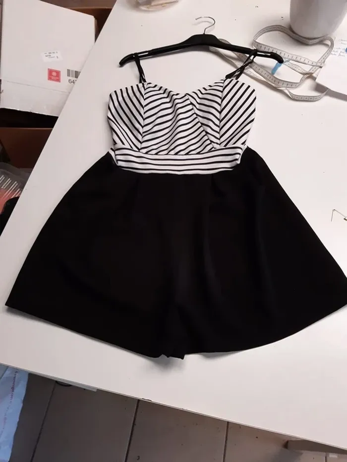 Jolie combi-short à fine bretelles de couleur noir unis en bas et rayer noir et blanc en haut. Coque pour la poitrine. Neuf, sans étiquette 🏷. Taille 36. Matières 95% polyester et 5% elasthanne. Mesures : longueur 58cm et aisselle à aisselle 35cm. N'hésitez pas à demander de plus amples informations.