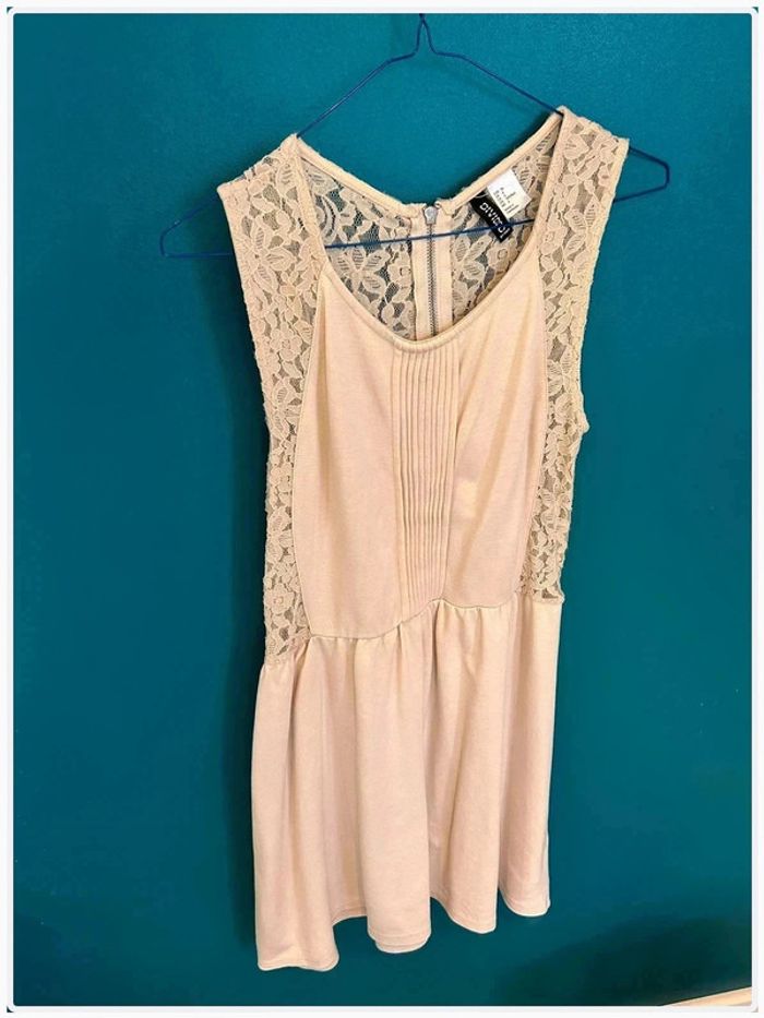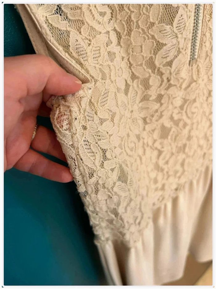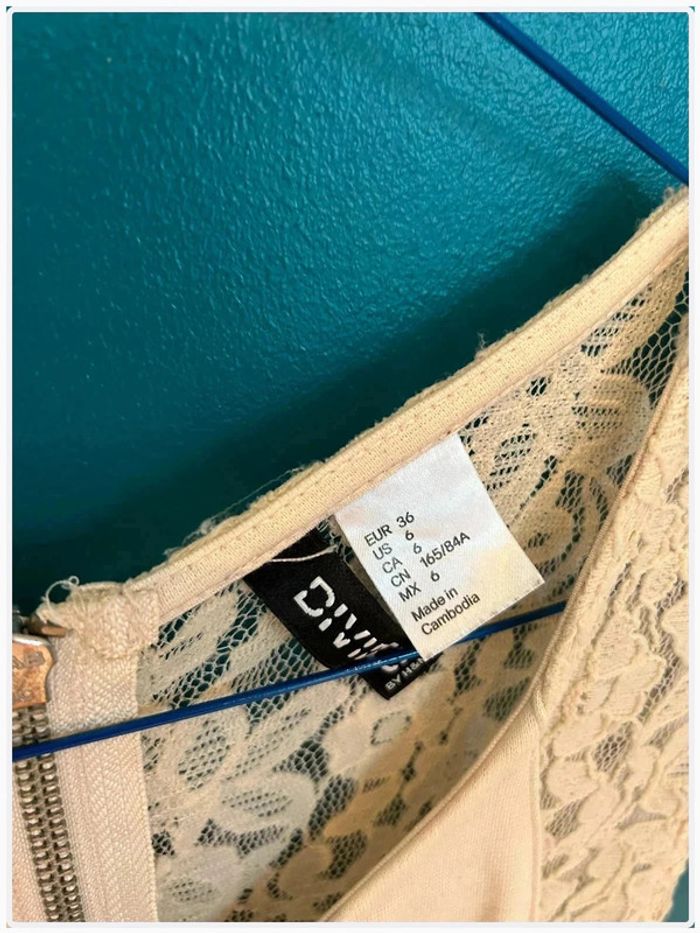 Jolie robe H&M, taille 36, couleur rose pâle voir beige. Détails en dentelle sur les côtés, fermeture éclair au dos. Bon état général. À noter : quelques bouloches sur la dentelle (voir photos).