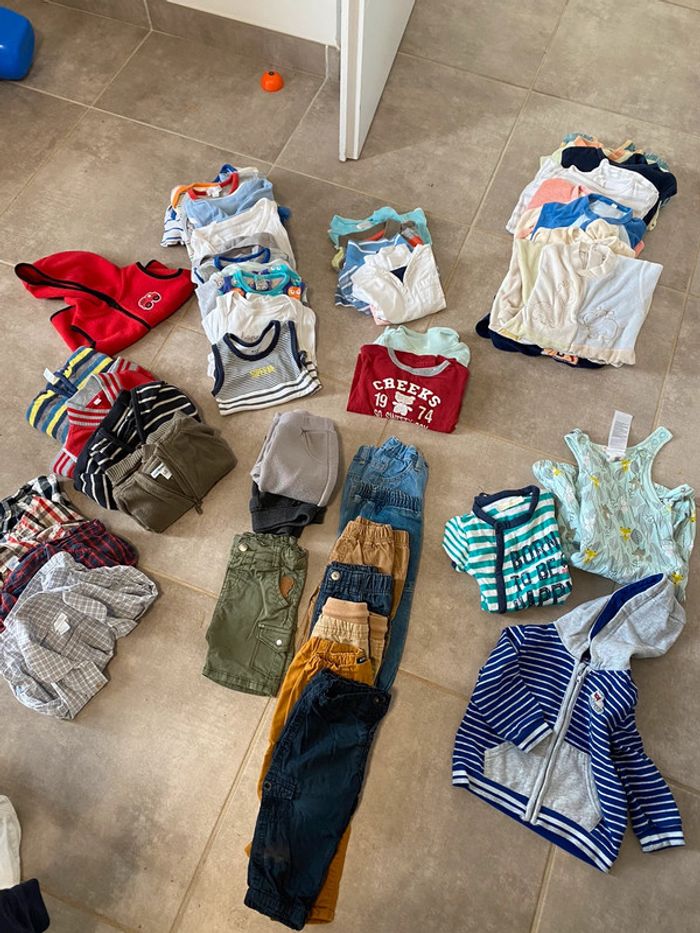 4 chemises 5 gilets 2 pantalons jogging 7 pantalons 1 short 3 manches longues 4 manges courtes 1 barbouteuse 1 combinaisons 1 polaire sans manche 10 pyjama dont 2 légers 6 bodies été offerts 12 bodies manche longues offerts 60 euros 57 pièces
