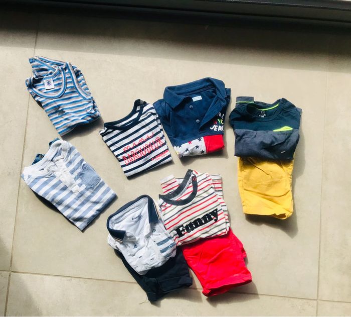 Lot de 5 ensembles 1 bodie 1 t shirt Soit 12 pièces #mariecharlotte2_12mois Vendu à l’unité egalement Le vert est légèrement tache à l encolure Le moutarde les lettres r et e se détachent légèrement se voit très peu une fois porté Matière idéale car c est l’âge où ils se déplacent et sont a l aise