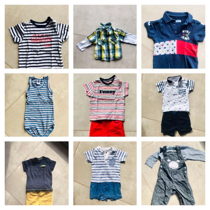 Lot de 5 ensembles 2 t shirt 1 bodie 1 chemise Soit 14 pièces #mariecharlotte2_12mois Vendu à l’unité egalement Le vert est légèrement tache à l encolure Le moutarde les lettres r et e se détachent légèrement se voit très peu une fois porté Matière idéale car c est l’âge où ils se déplacent et sont a l aise