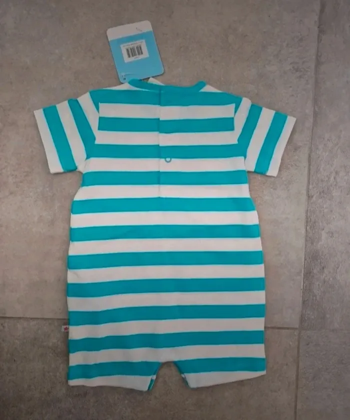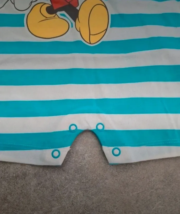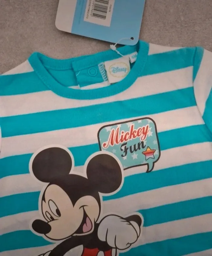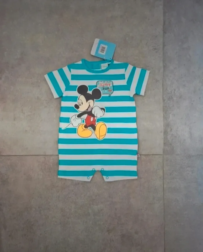 Adorable combishort Disney Mickey pour bébé garçon, taille 6 mois. Rayé turquoise et blanc avec un grand motif Mickey et l’inscription "Mickey Fun". Fermeture à pressions à l’entrejambe pour un habillage facile. Neuf avec étiquette, jamais porté. Parfait pour l’été ☀️ #dresskids6mboy