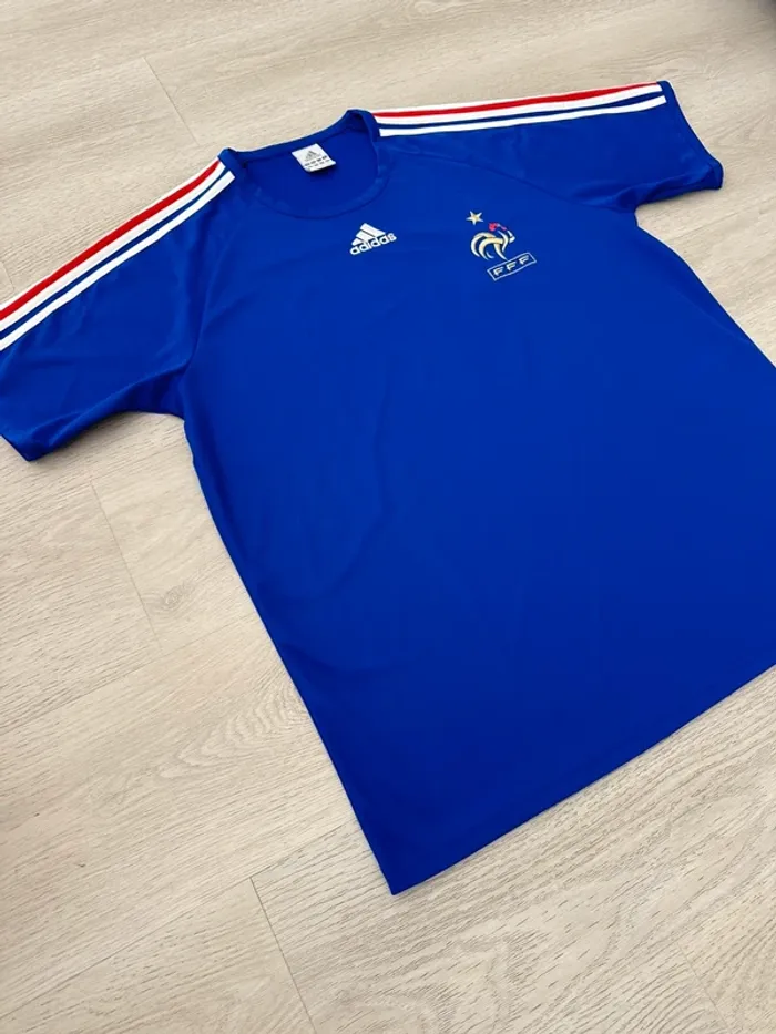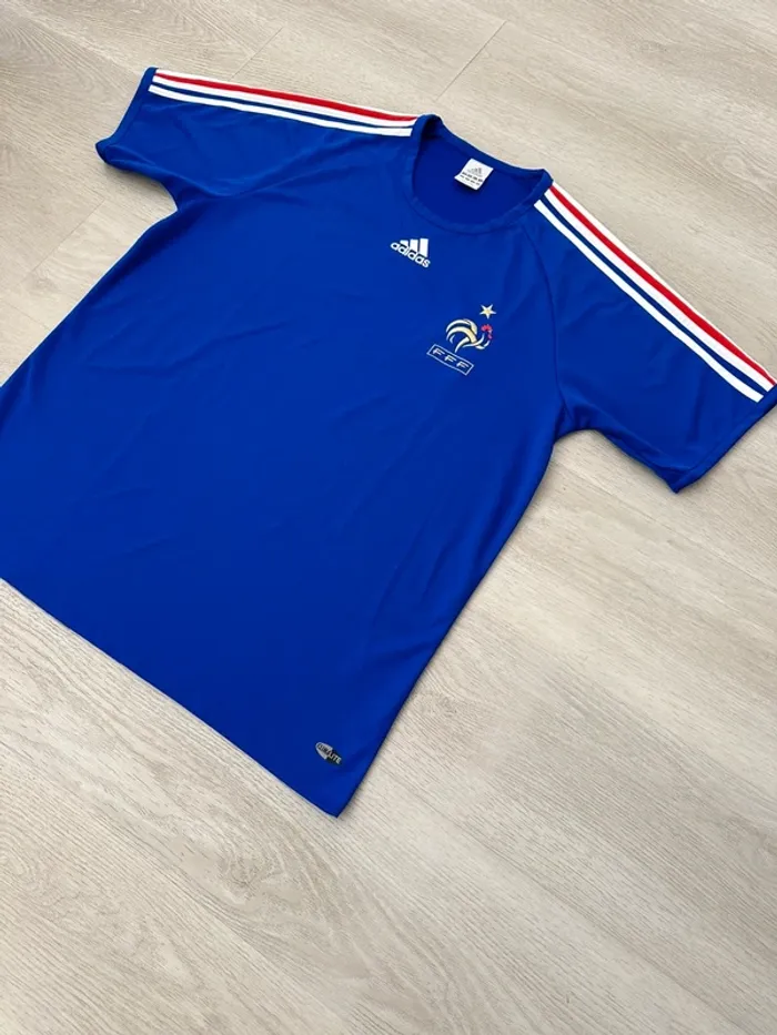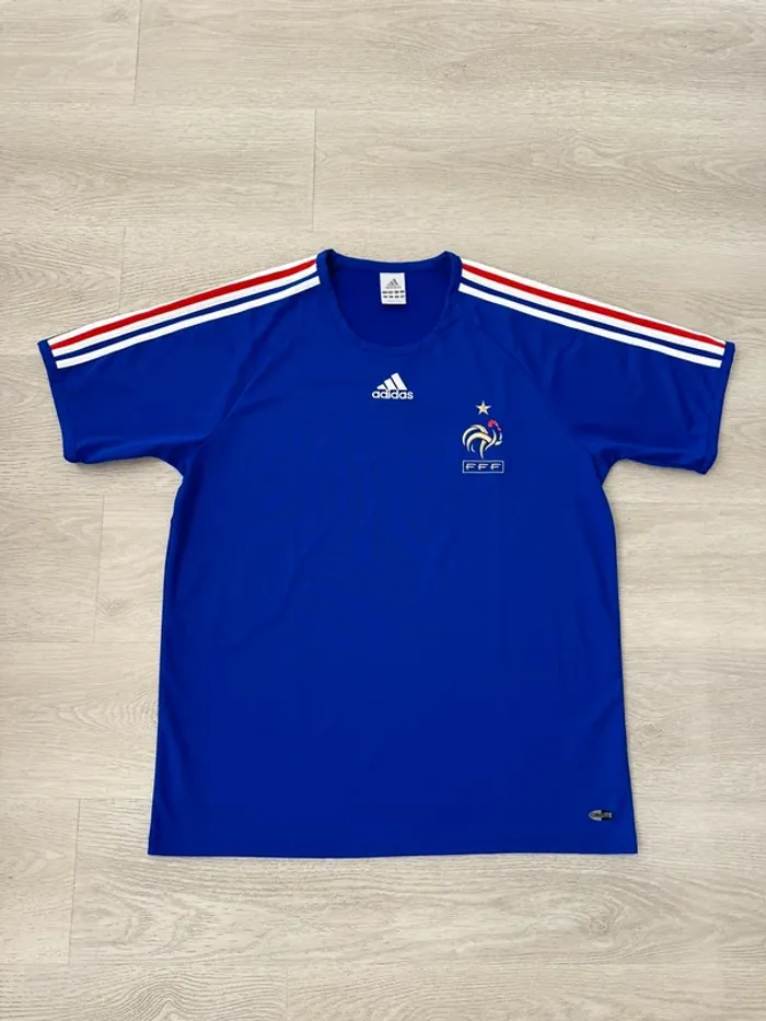 T-shirt équipe de France football 2007 | 2008 Foot paris sport soccer JO vintage collection Haut Taille L Épaules 48 cm Largeur 56 cm Longueur 73 cm Bon état, petit accroc voir dernière photo Zidane jeux champions league