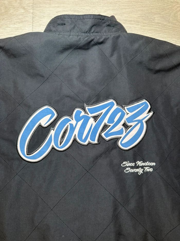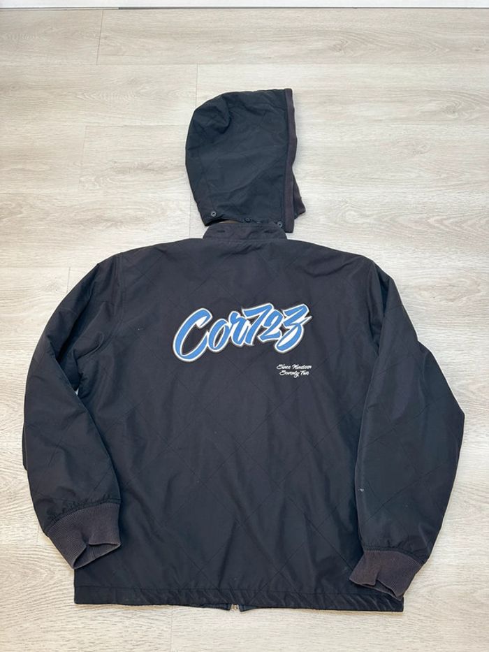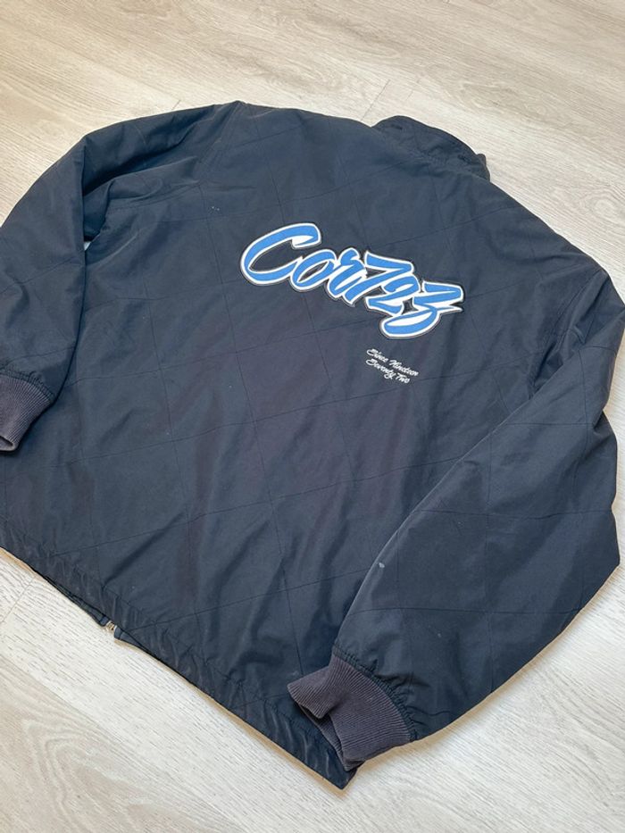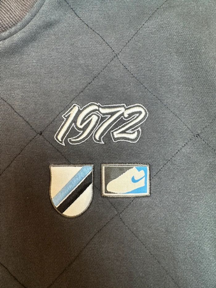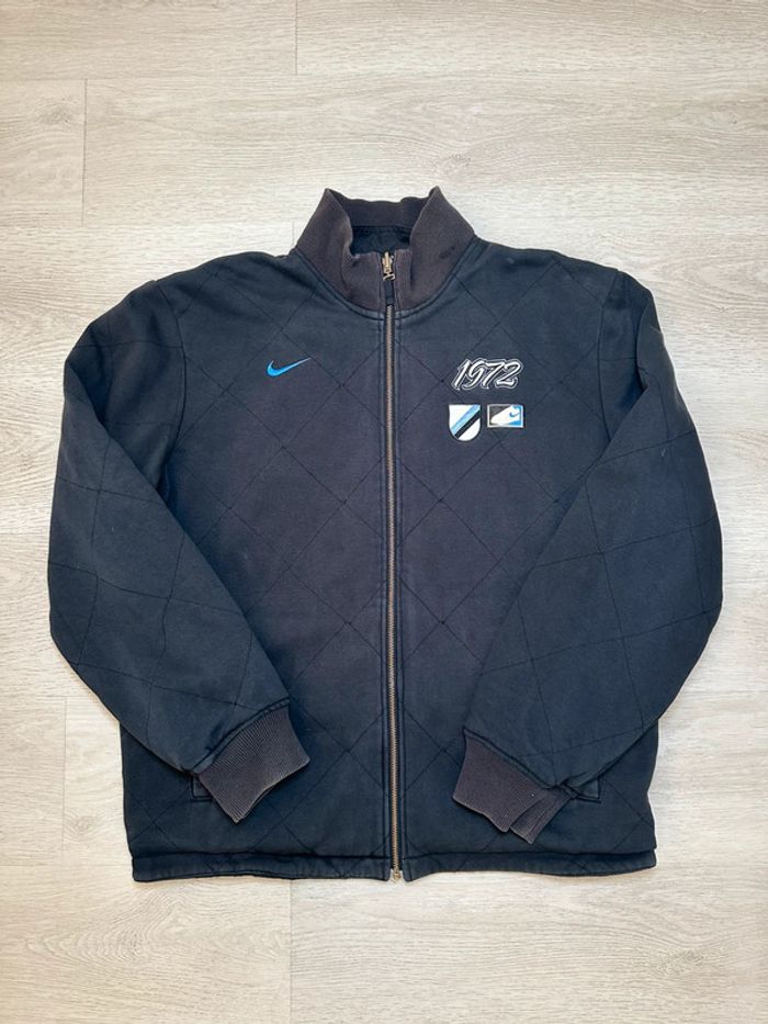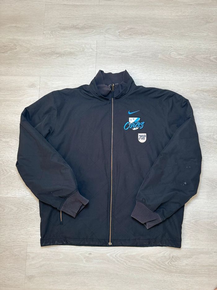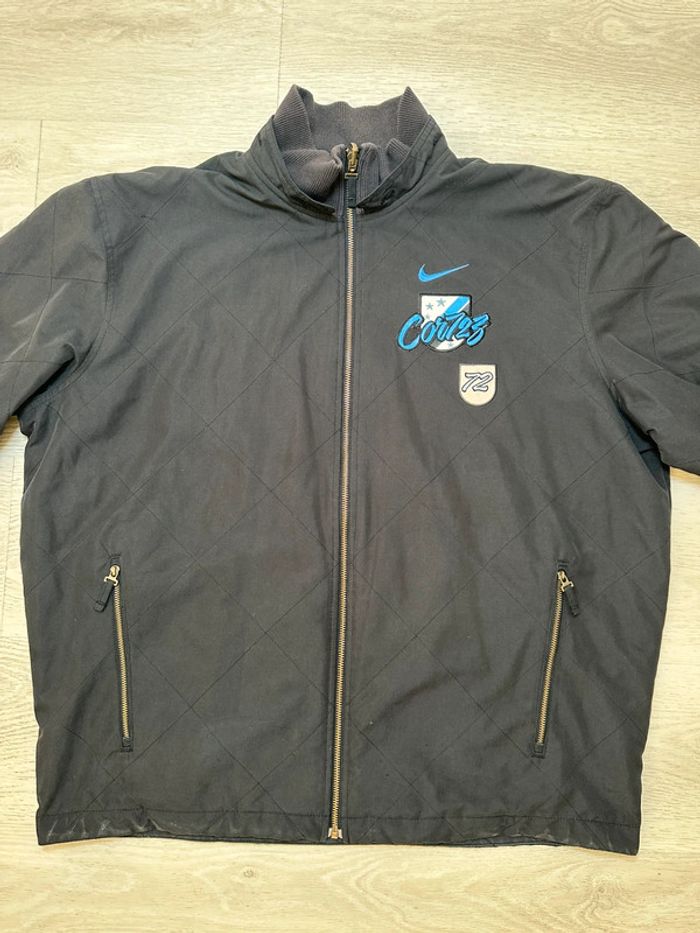 Blouson réversible Nike Cortez 1972 Bombers de 2007 avec capuche amovible le swoosh Nike et l'imprimé graphique jacket Cortez collection vintage retro Taille L Épaules 53 cm Largeur 63cm Longueur 68 cm Quelques taches voit photos Survêtement jogging armour face sport football