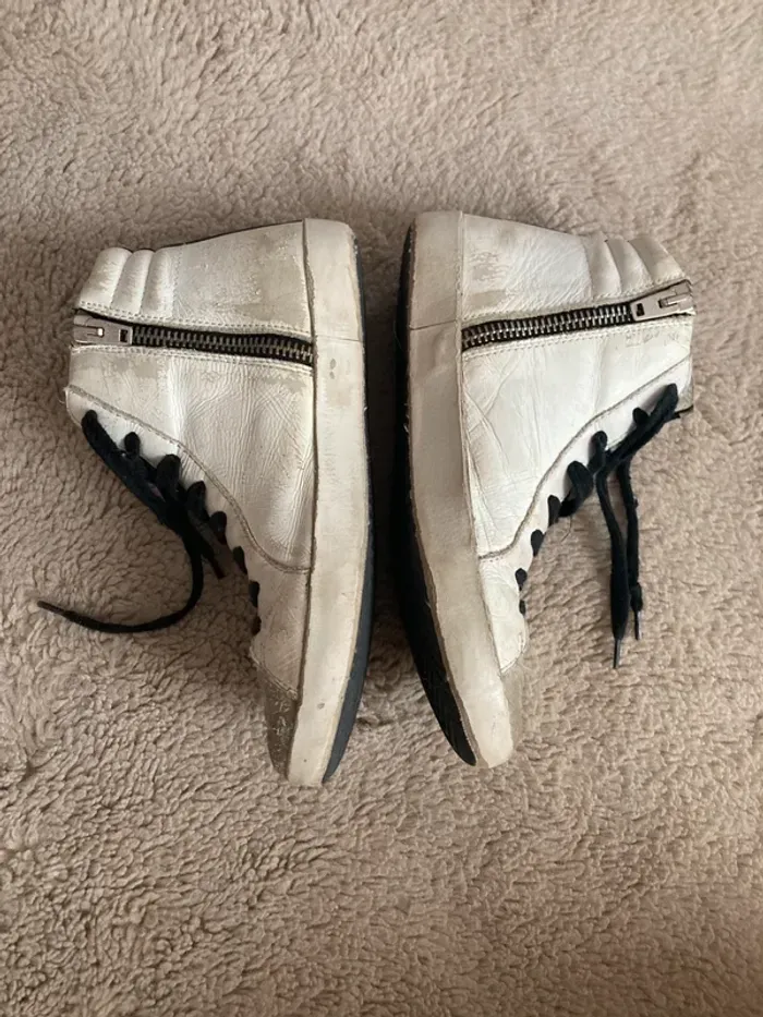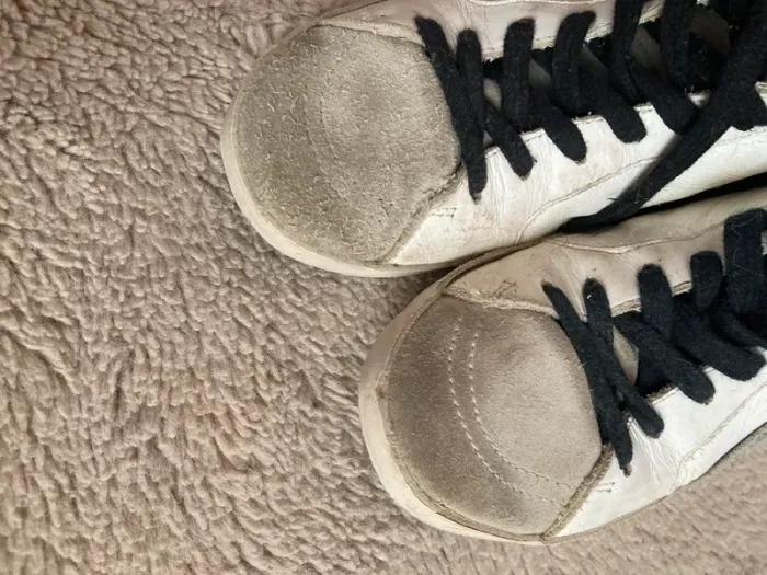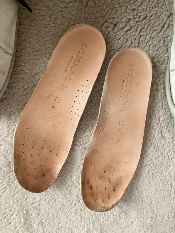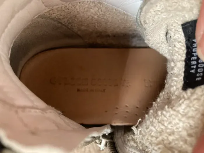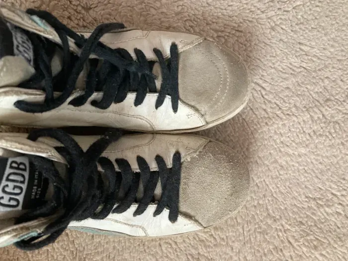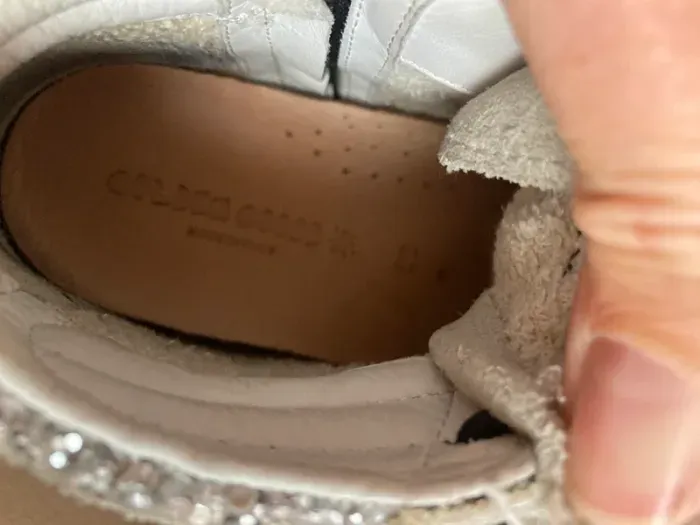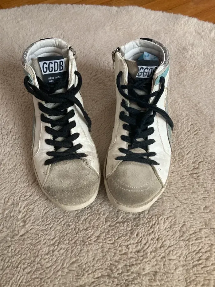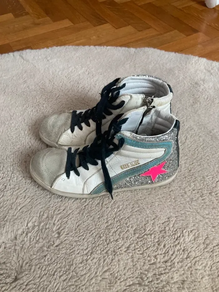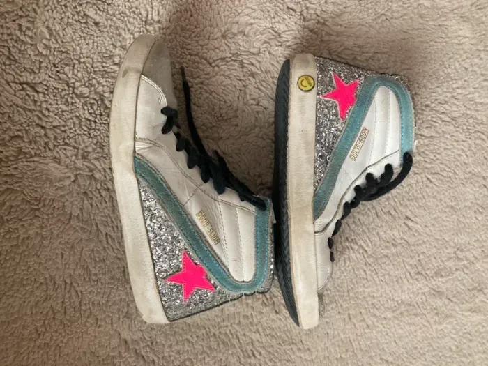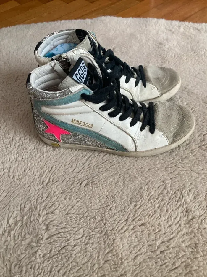 Golden Goose Modèle slide montantes Pointure 33 Voir photos pour les points d’usure (talons, avant, un bord un peu effiloché sur le dessus de la chaussure ) Fermeture éclair du pied gauche plus difficile mais s’ouvre et se ferme Sinon très bon état et surtout encore canons ! 🤩 Pailletées argentées, étoile rose fluo, slide bleu turquoise Bien regarder toutes les photos et ne pas hésiter à en demander d’autres !
