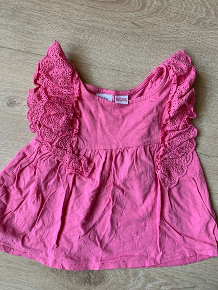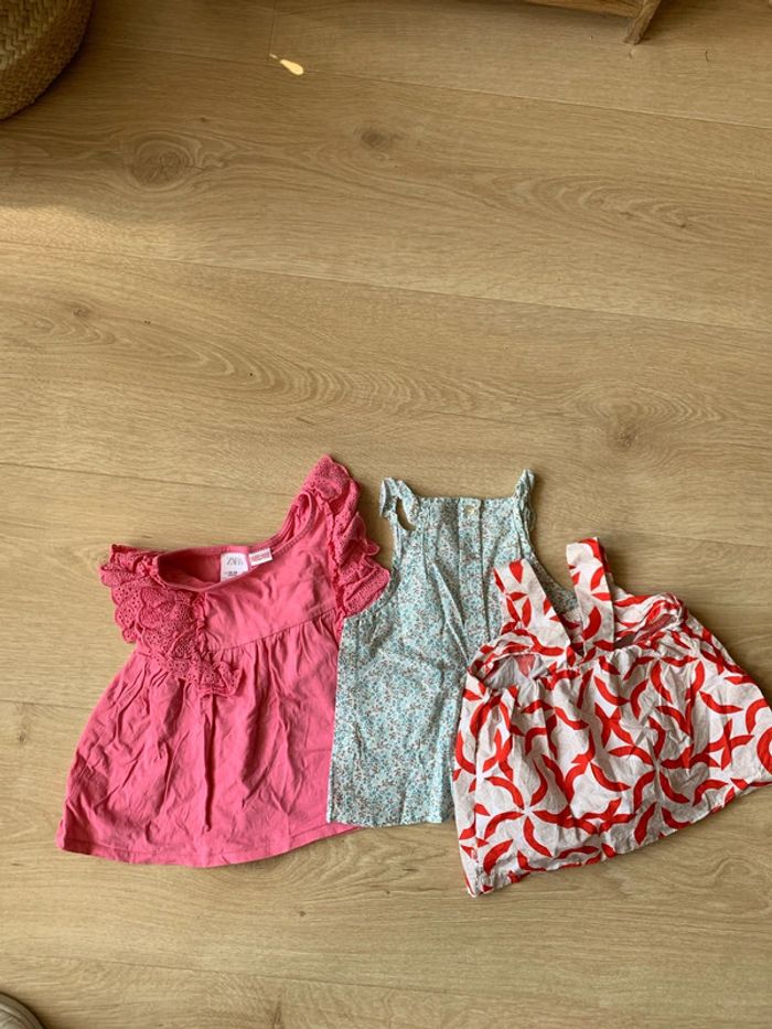 Lot 3 hauts 18 mois 1 rose dentelle Zara 1 liberty bleu TCF 1 obaibi rouge #ete18mois #lot18moisfille #top18moisfille #hauts18moisfille #teeshirt18moisfille #obaibi18moisfille #tcf18moisfille #liberty18mois #zara18mois