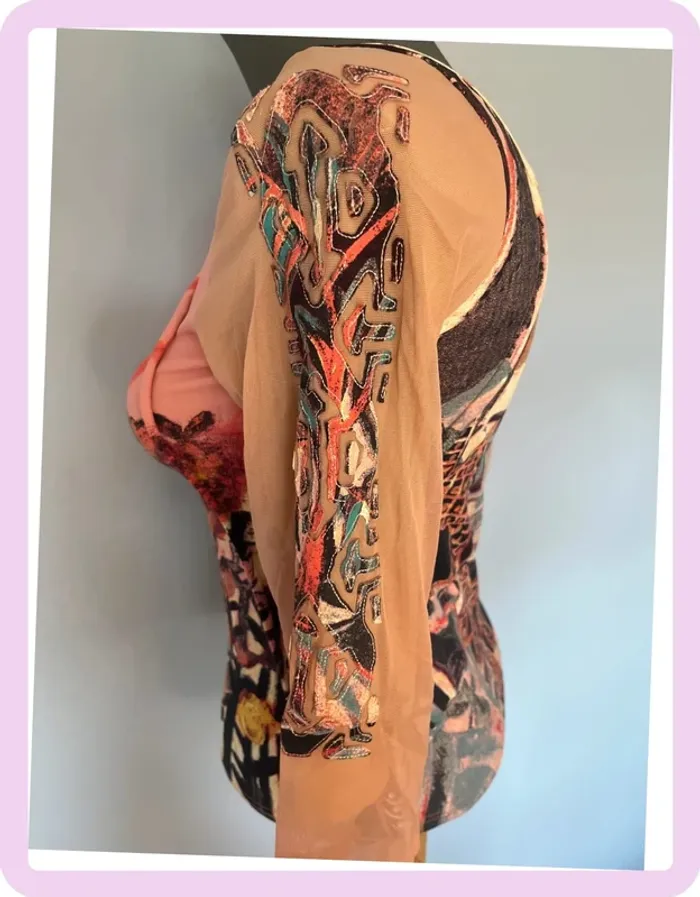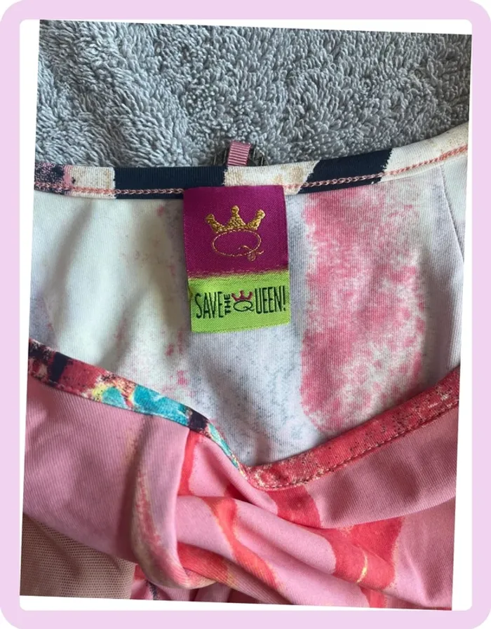 🌺 T-shirt Save The Queen – Taille L – Rose & noir avec manches tulle beige 🌺 - photo numéro 7