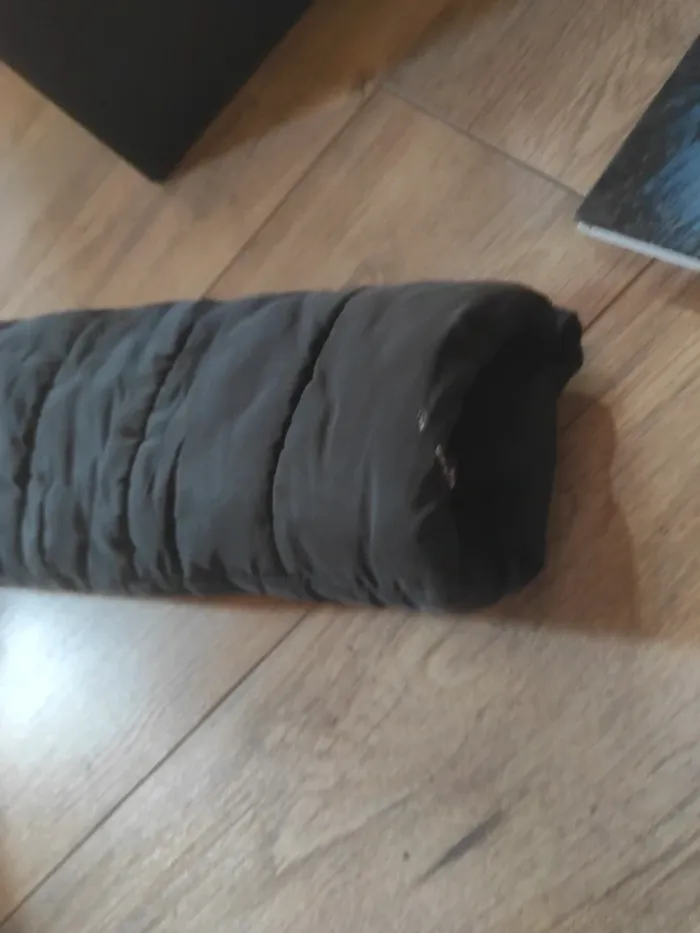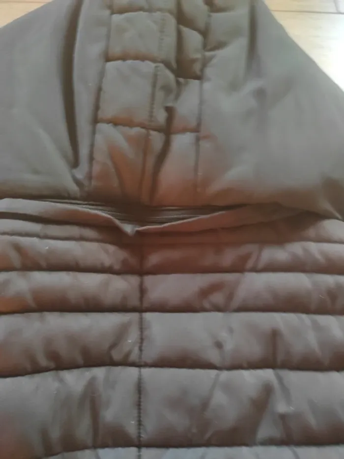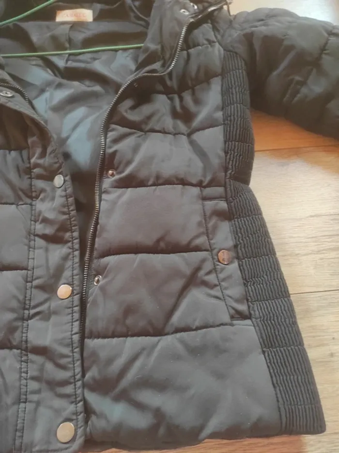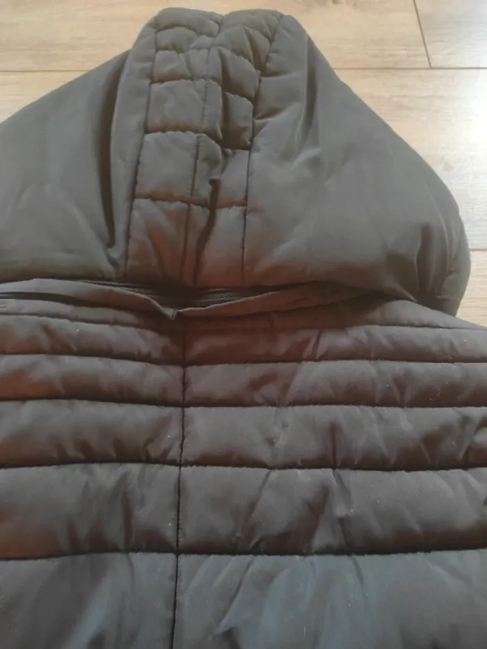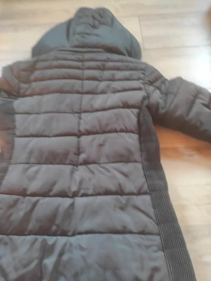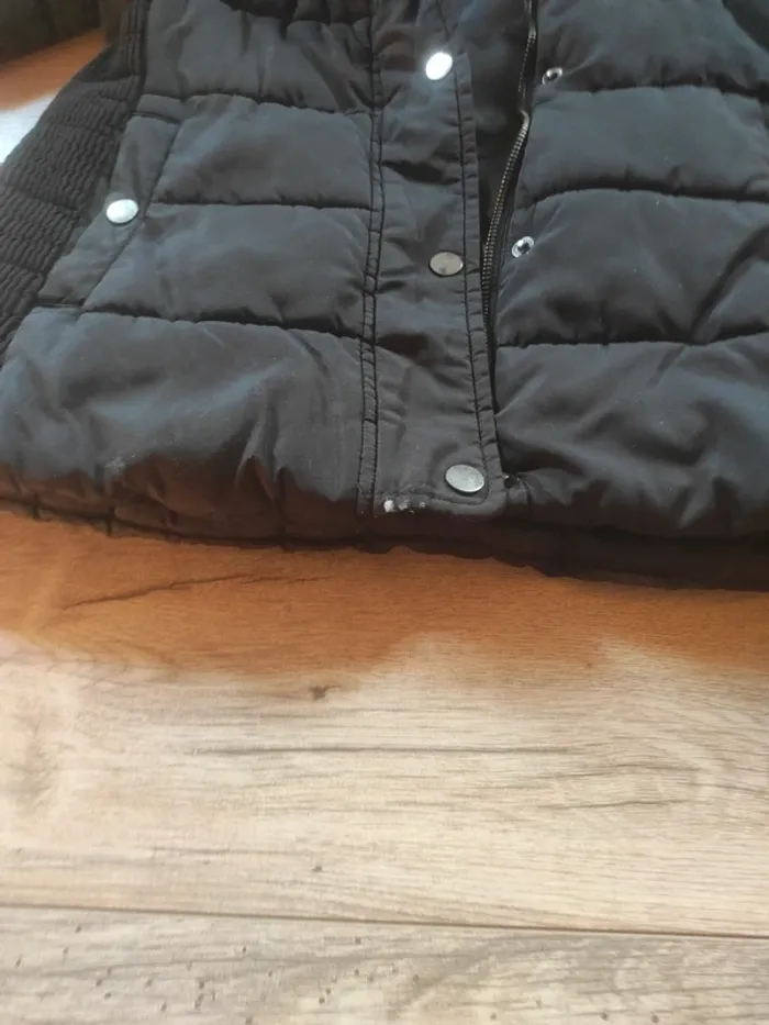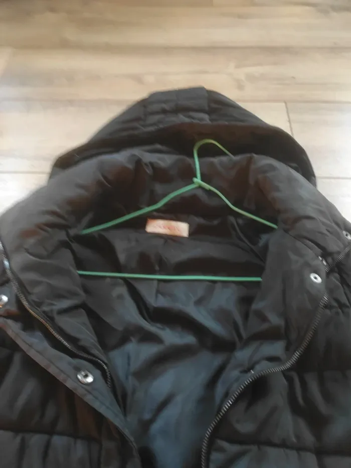 Avec capuche détachable , légère trace blanche en bas fermeture éclair et sur manche( voir photo)