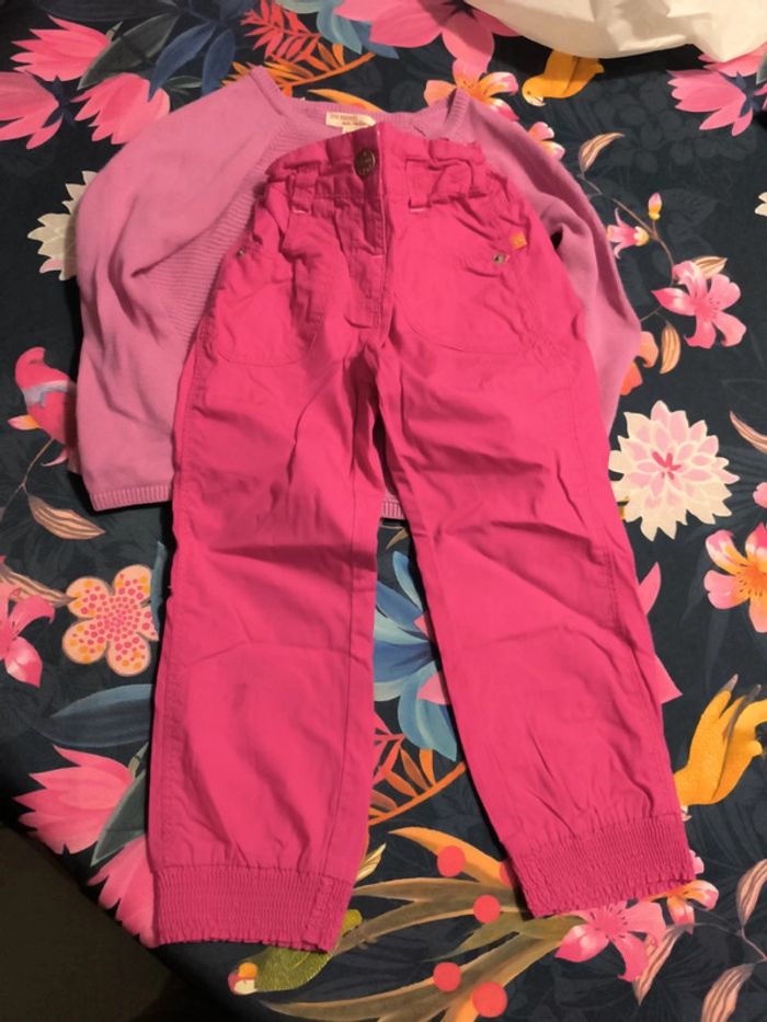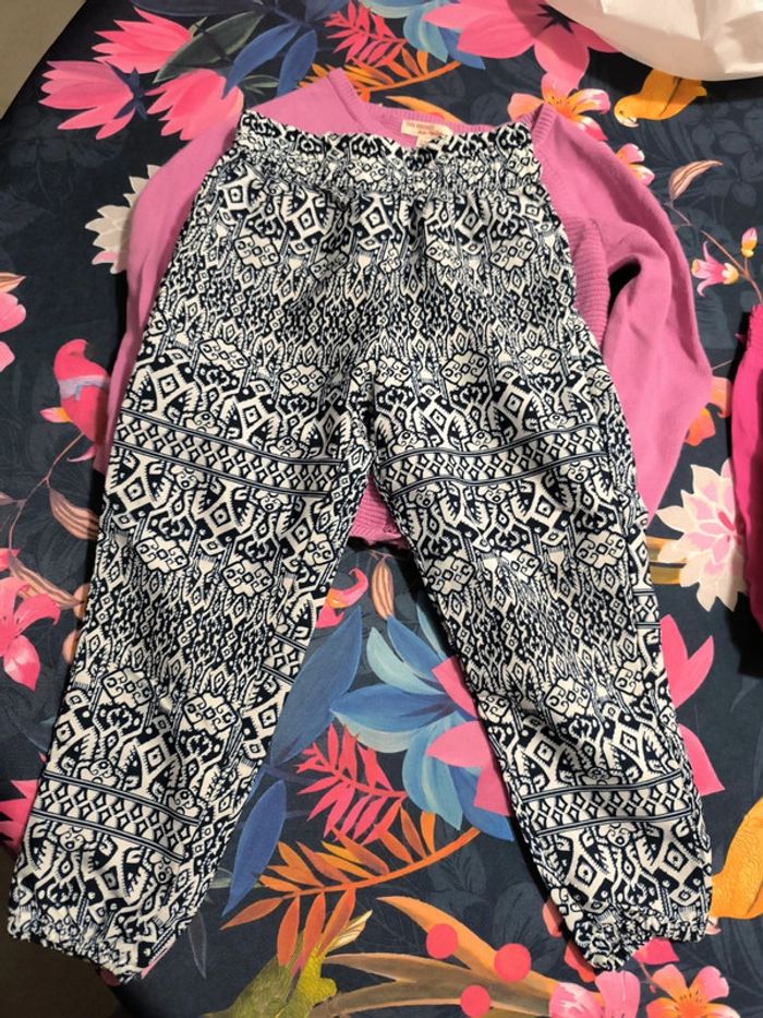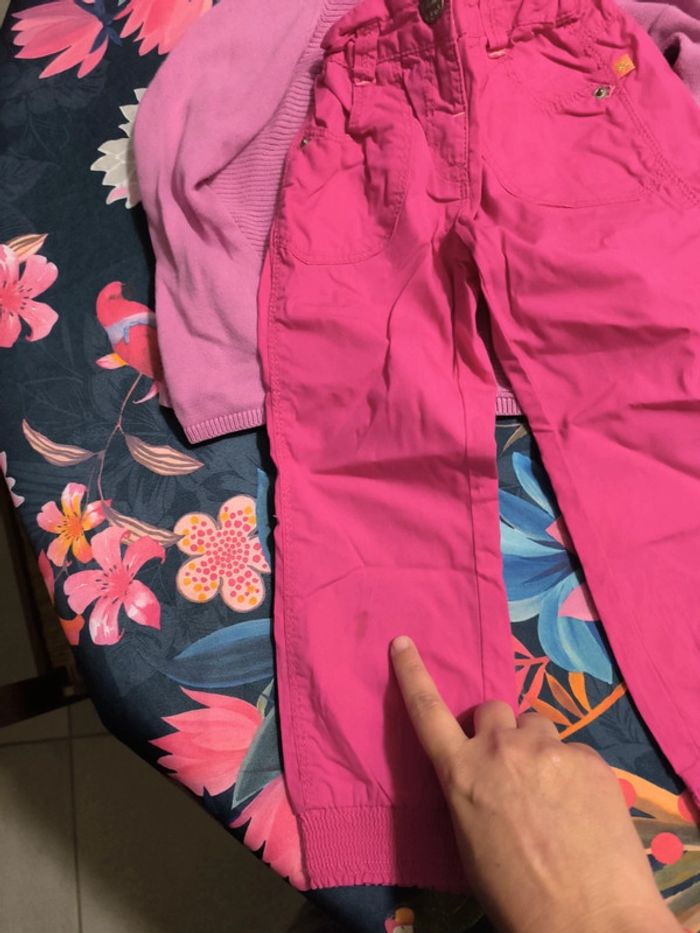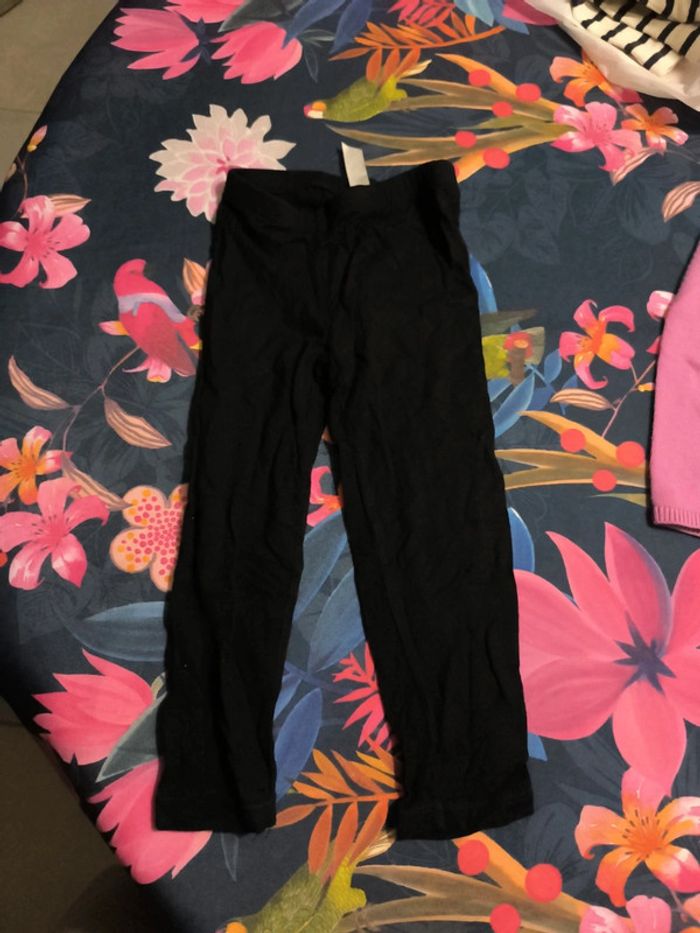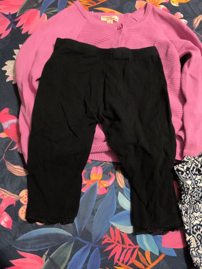Il manque 2 boutons au gilet du pareil au même Tache sur le pantalon rose kid kanai Pantalon fluide comme neuf Leggings courts noirs en bon état (un trou sur l'un d'entre eux) Legging rose en bon état #tometdine3ans
