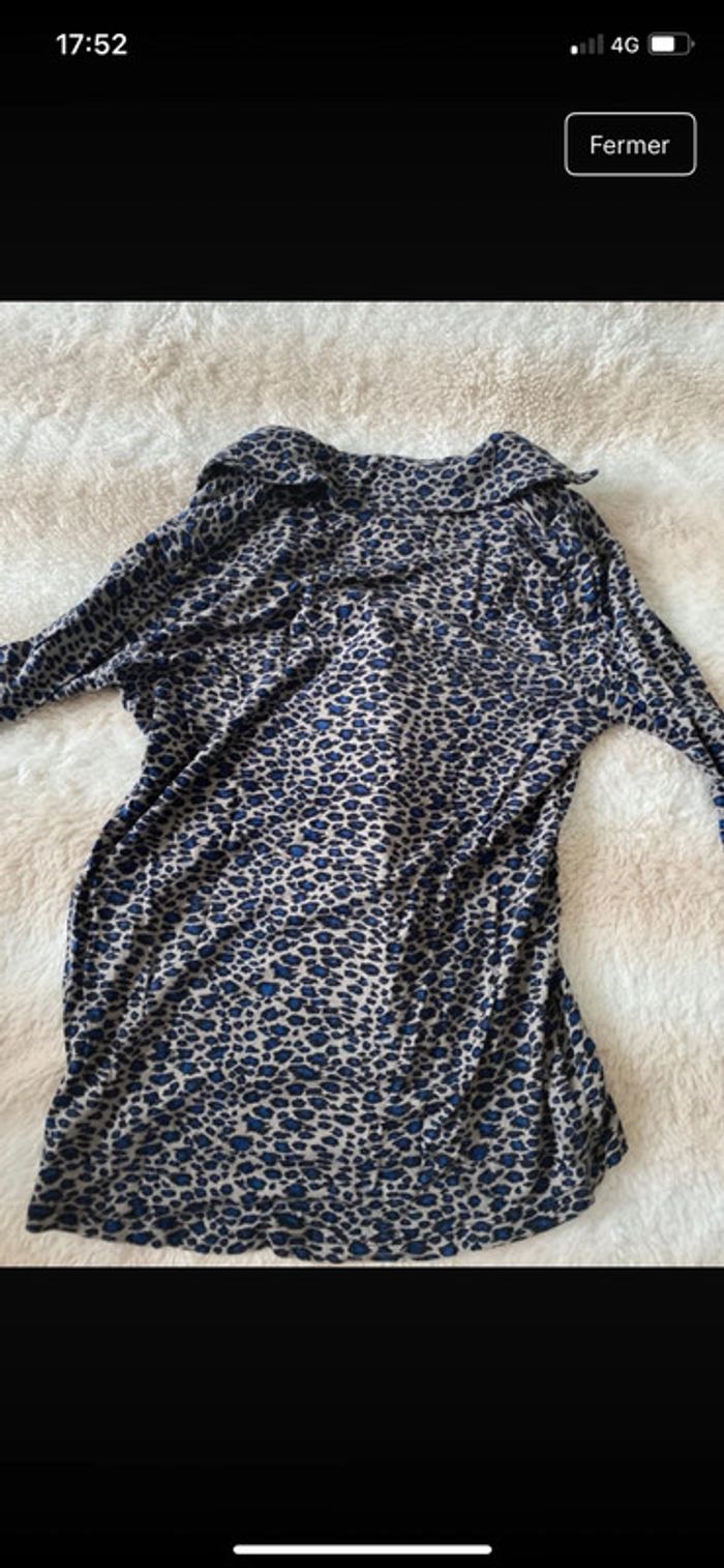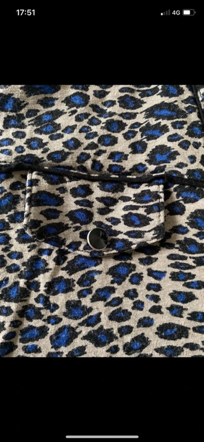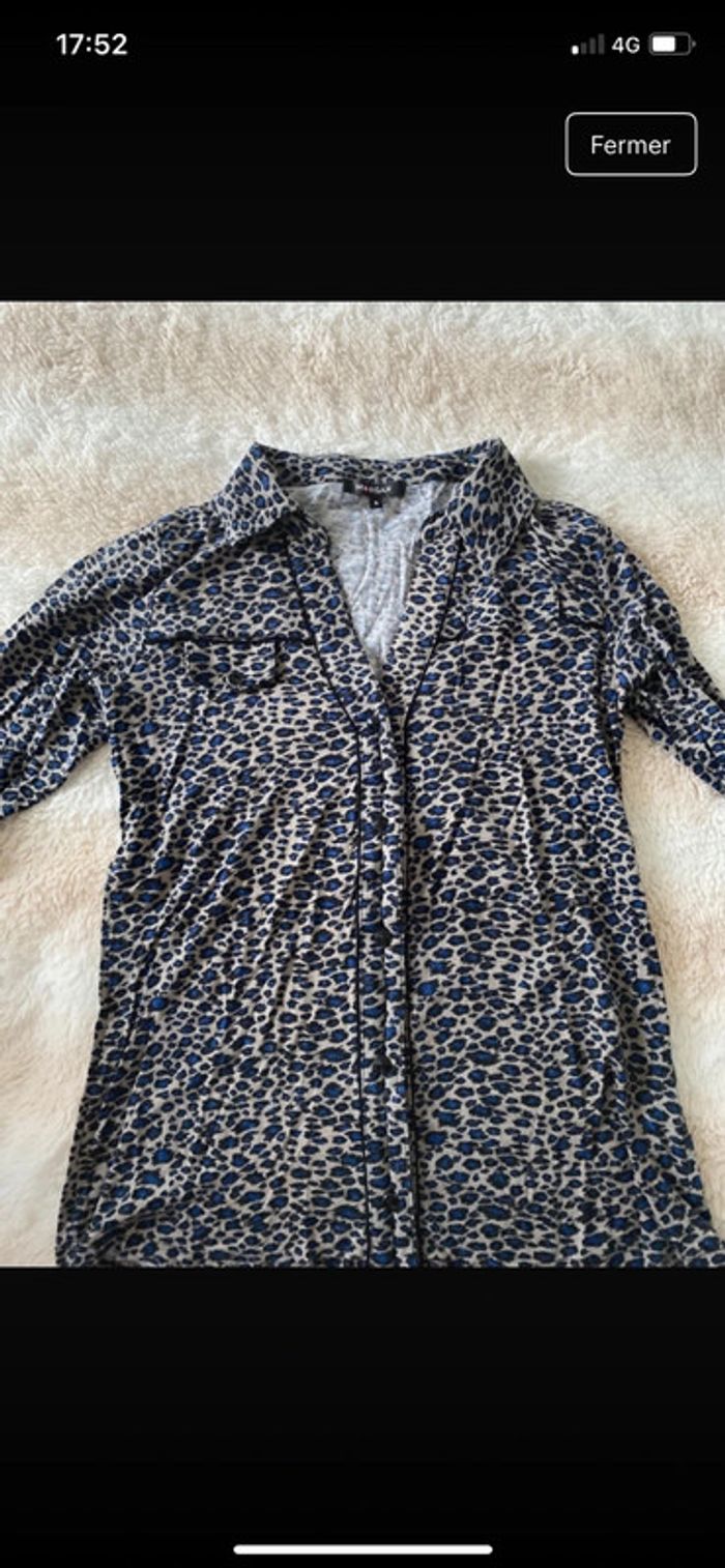 Chemisier morgan matière tee shirt, motifs léopard bleu. Boutons noirs brillants
