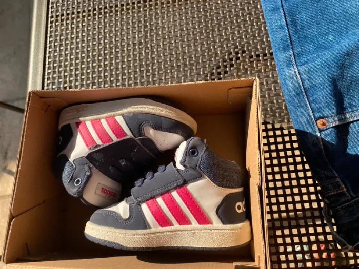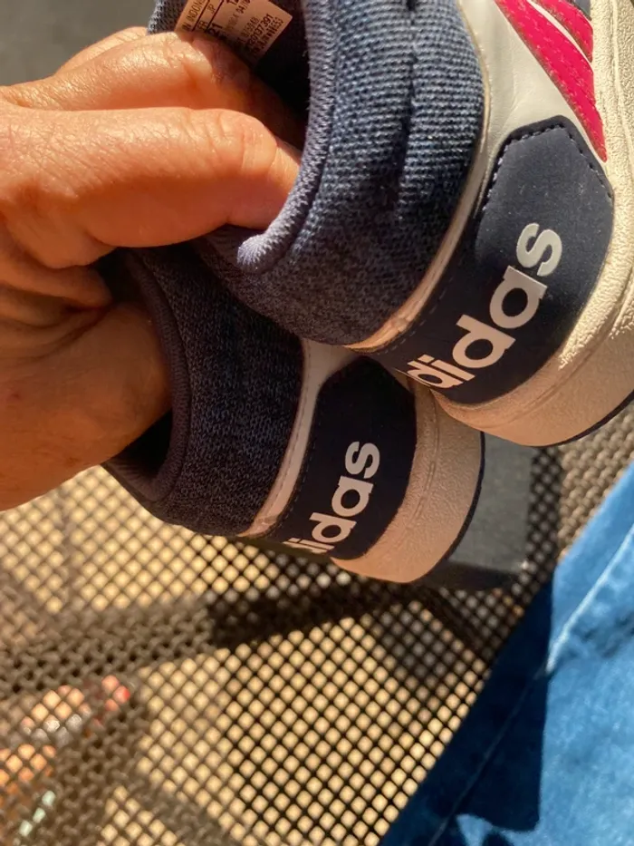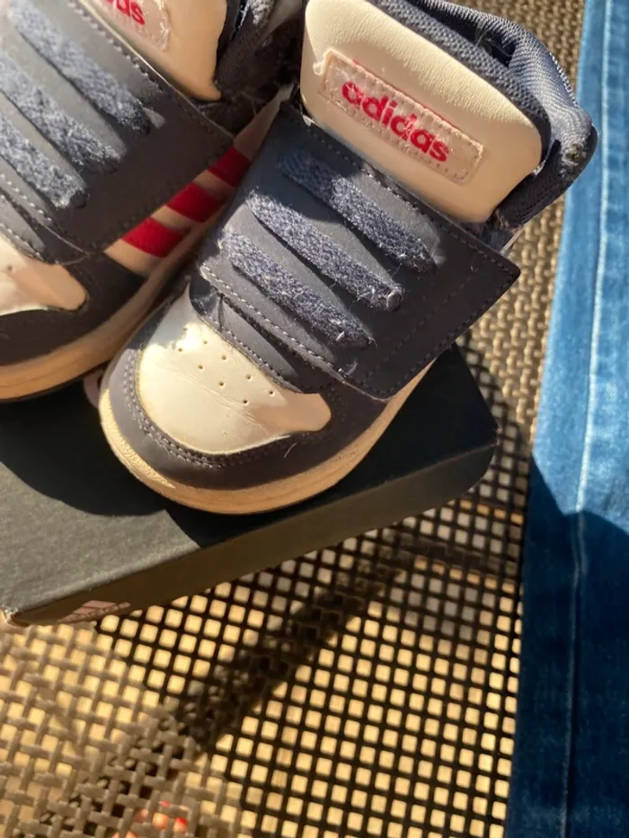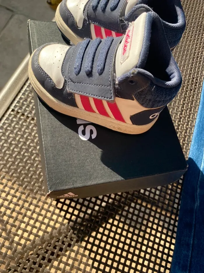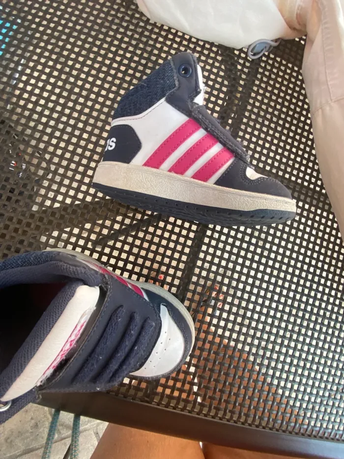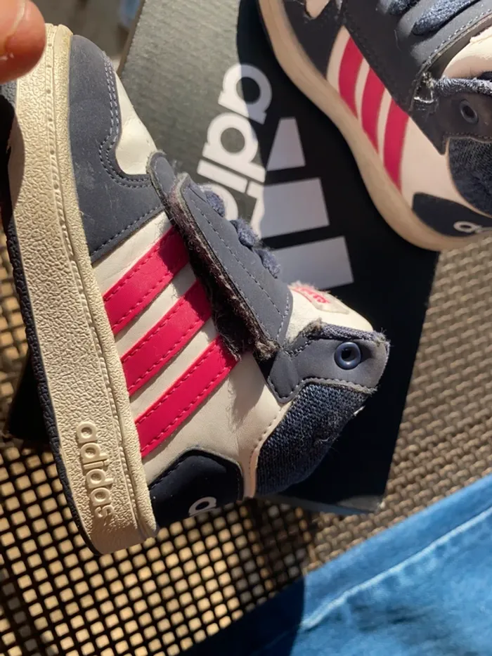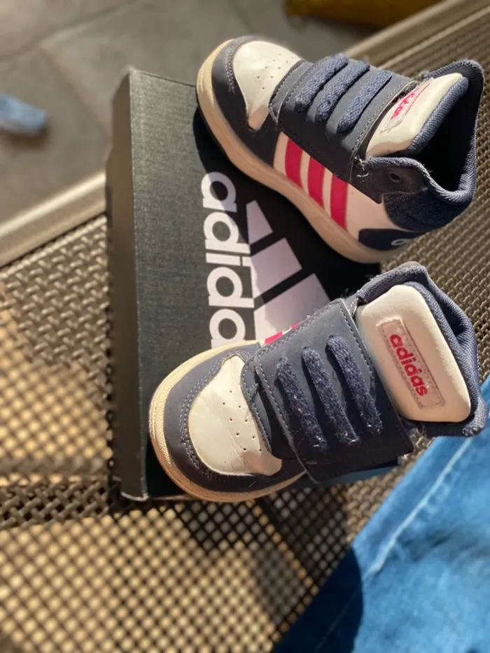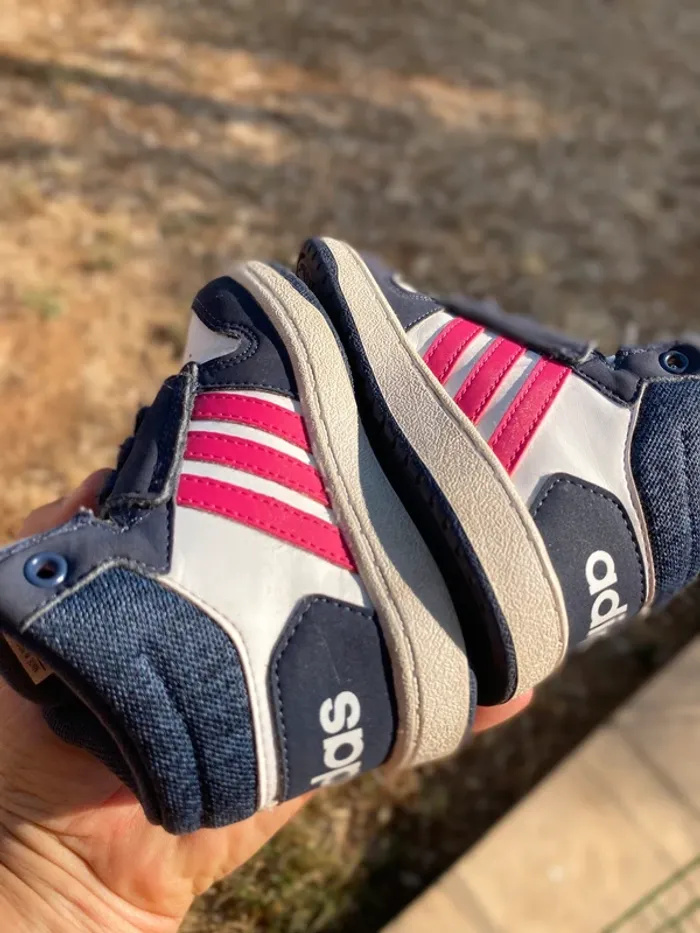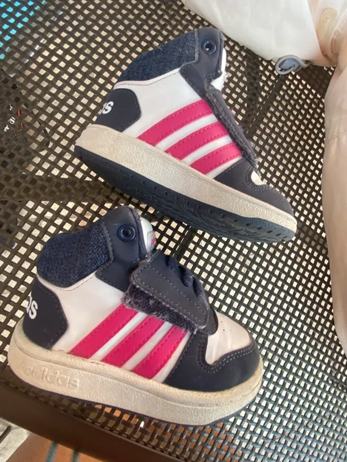 Baskets Adidas montantes Très bon état·adidas Marque Adidas Taille 21 État Très bon état Matière Cuir Couleur Blanc, bleu marine et rose Baskets, élastique et scratch facile à enfiler
