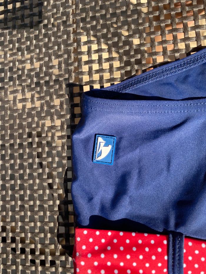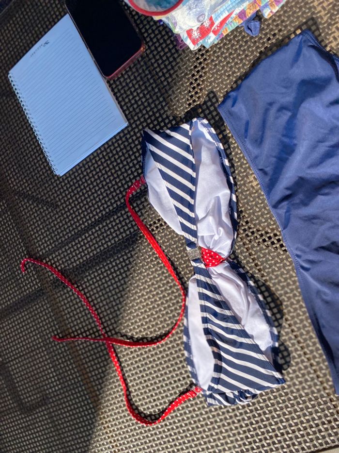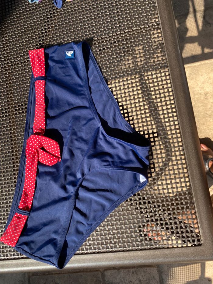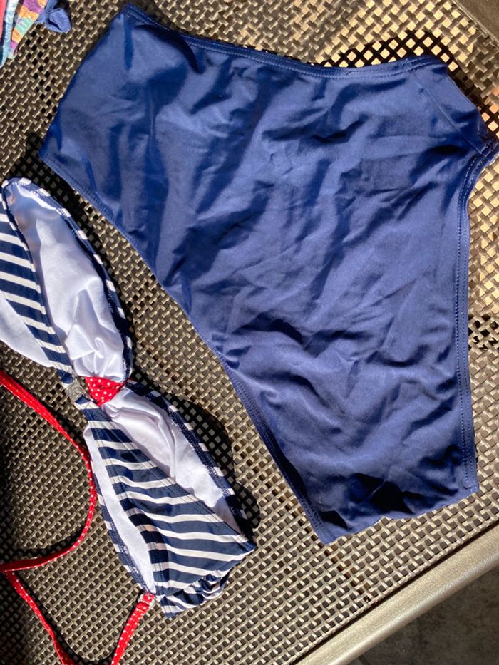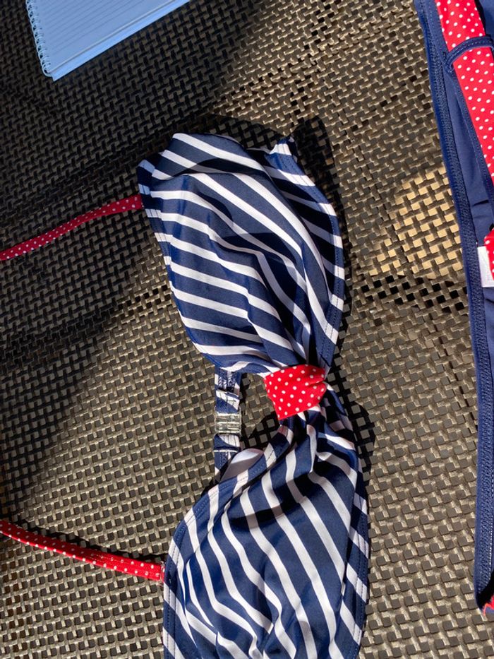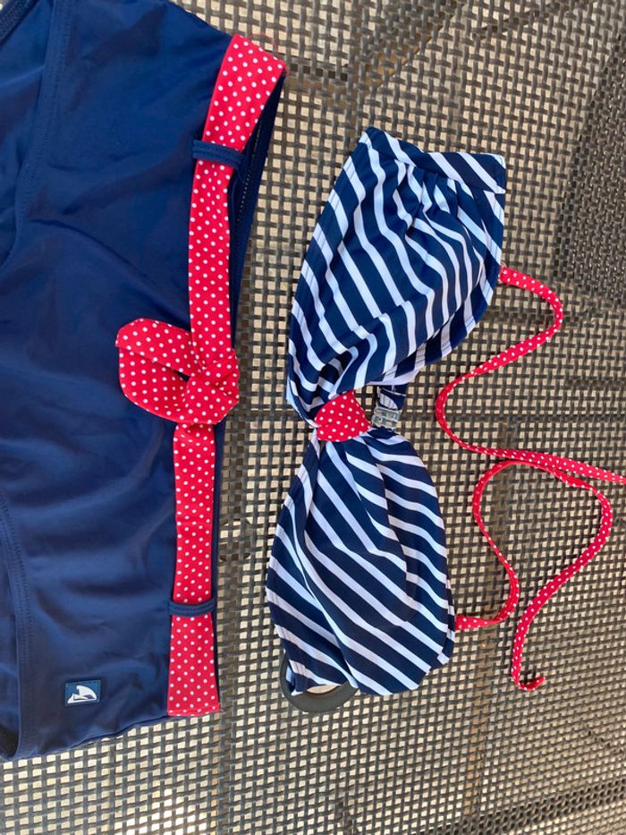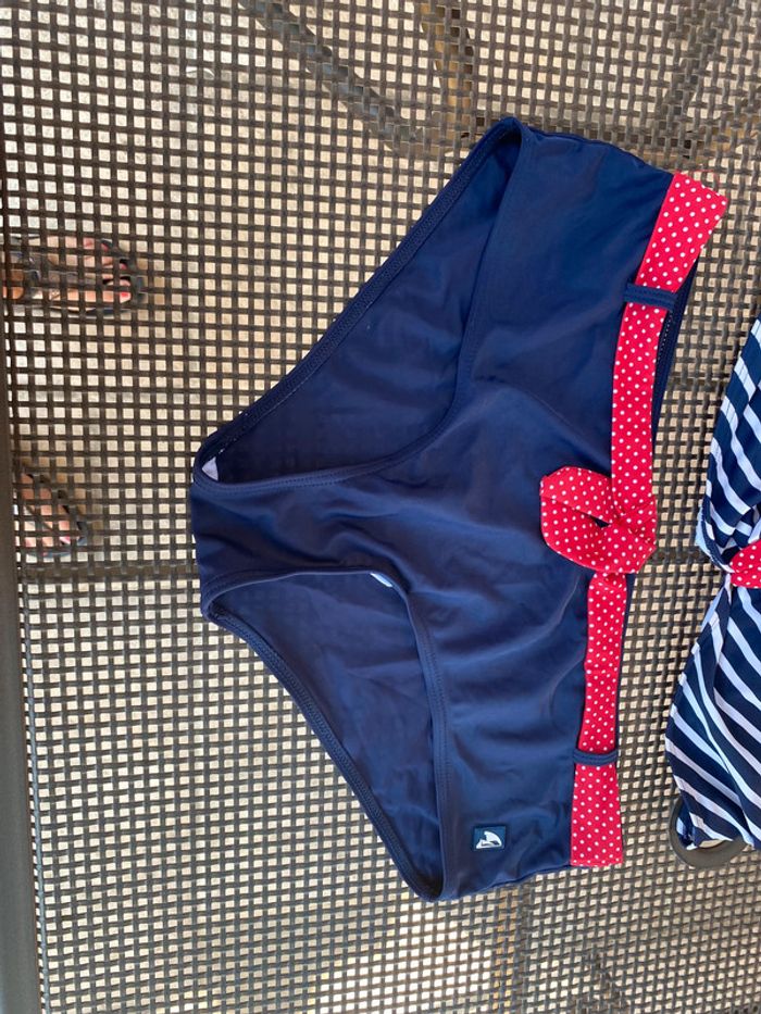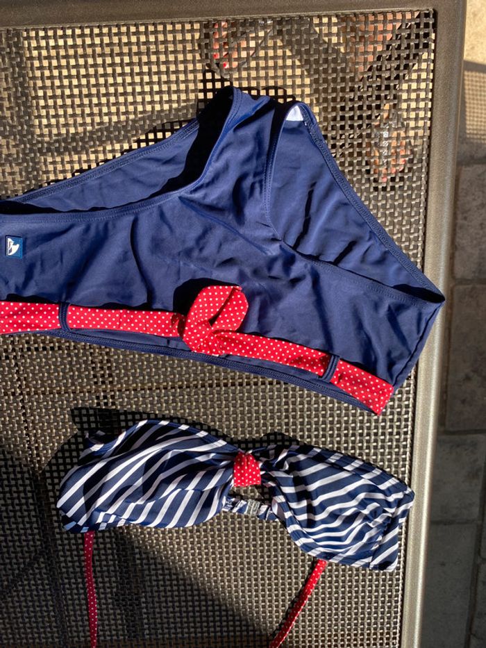 Joli bikini, délicieusement, vintage, couleur bleu marine et eau à rayures, bleu marine et blanche avec noeuds rouges neuf
