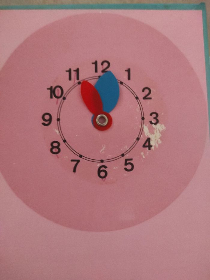 Livre de manipulation pour apprendre à lire l'heure. Le cadran est un peu abîmé (voir photo). #tometdineenfant #tometdineeducatif