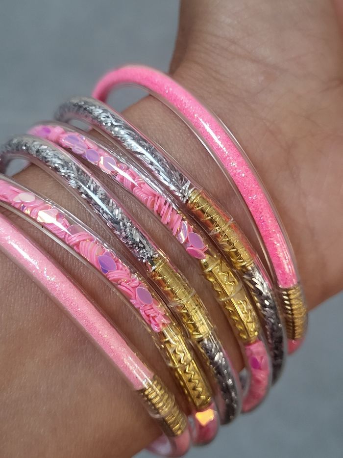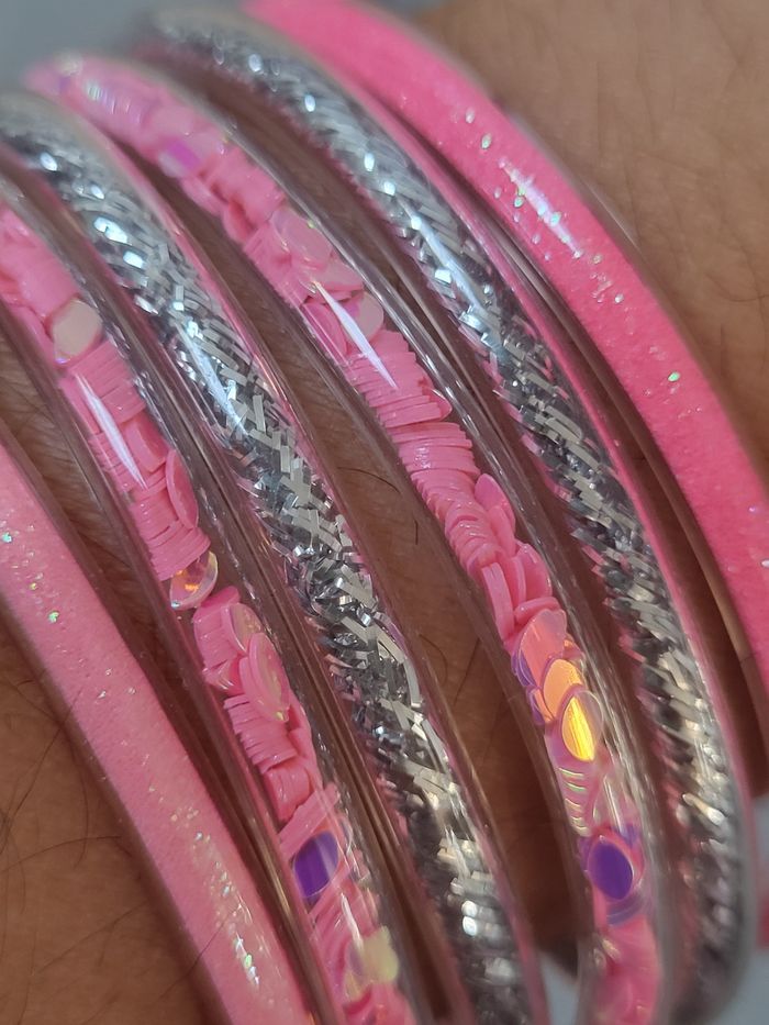 Ensemble de 6 bracelets type jonc bouddhiste paillettés Couleur 1 x rose / 1 x rose clair / 2xrose électrique/ 2x argenté givré Resistants à l'eau Taille 6,5cm Souples et légers en plastique transparent S'accumulent au poignet sans bruit