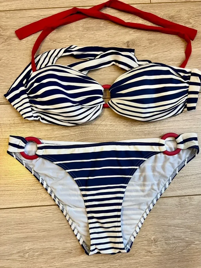 Joli maillot de bain 40 marine avec pointe de rouge Bretelles amovibles Acheté 59€ Très bon état #maillotdebain40 #etetaille40 #bathingsuit #kiwisaintropez #sainttropez #bananamoon