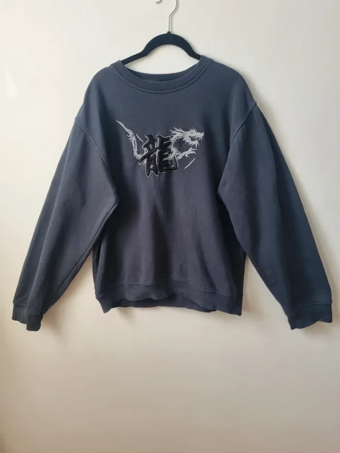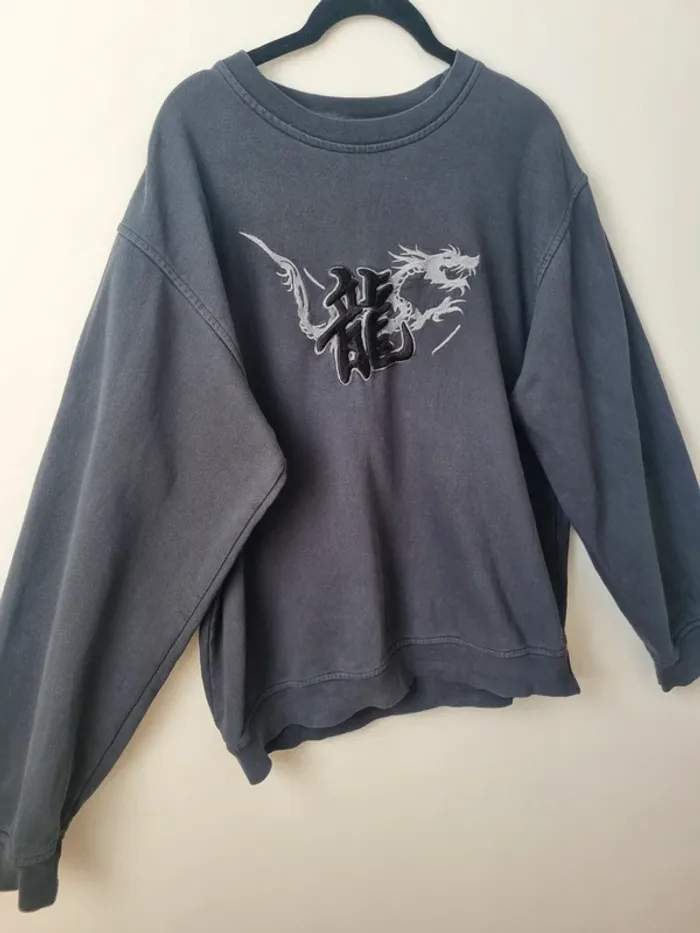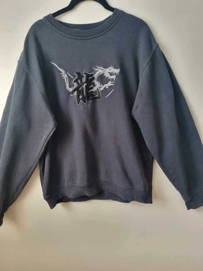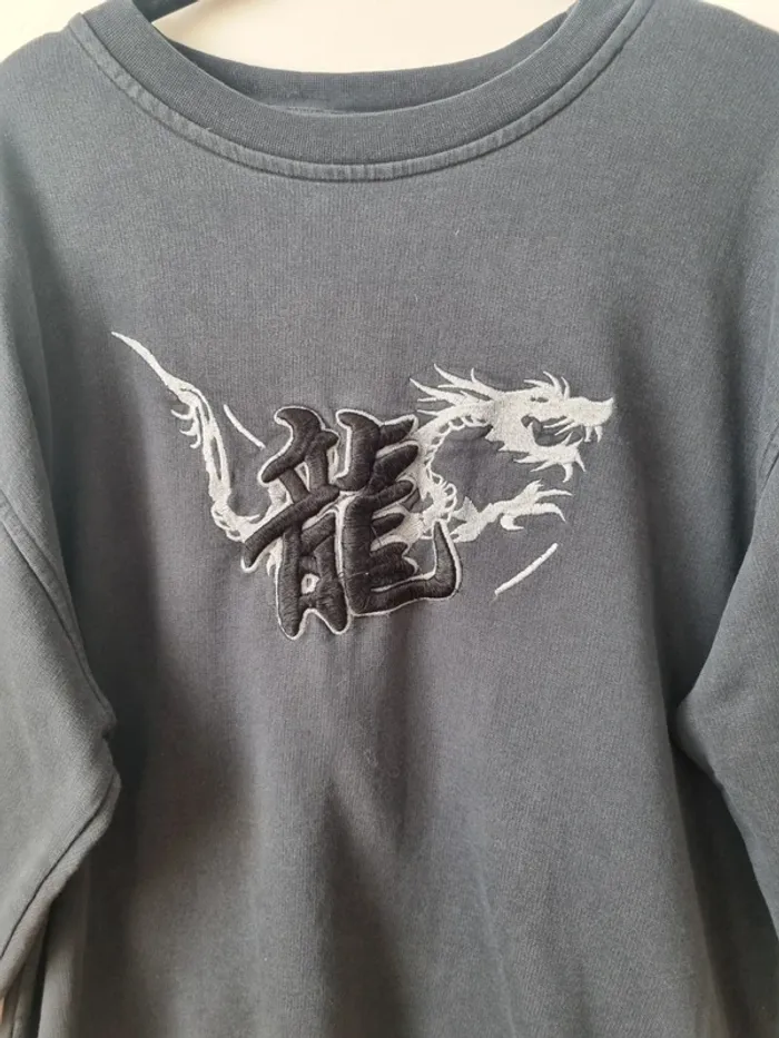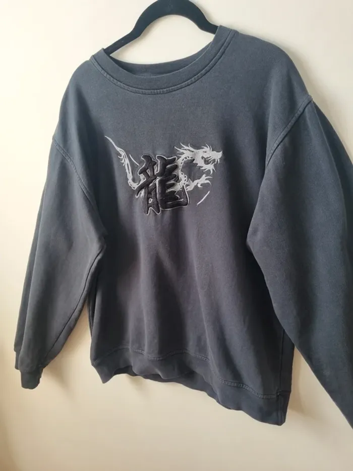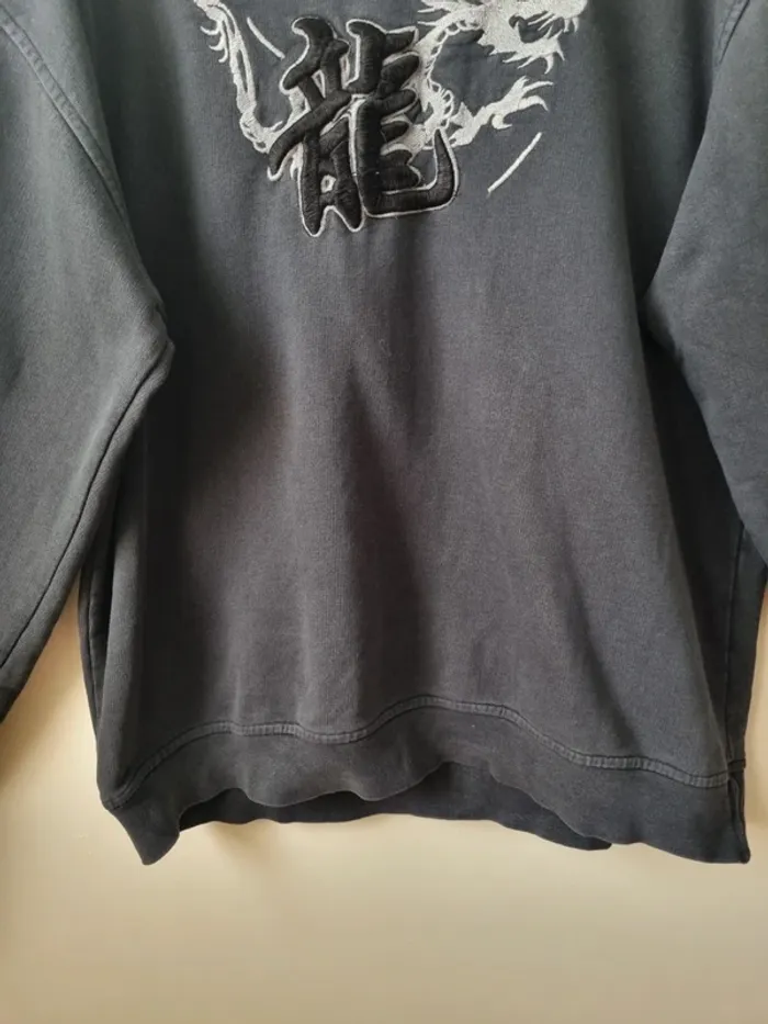 Magnifique sweat Clockhouse en coton 100 % coton Beau dragon brodé dessus en gris Sweat gris anthracite En bon état Marque : Clockhouse Resseré aux manches Taille XL Dimensions : - Largeur épaules : 54 cm - Longueur dos : 66 cm - Largeur aiselles : 60 cm - Largeur taille : 60 cm