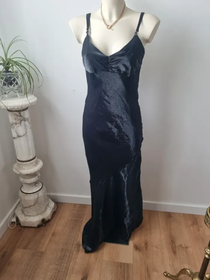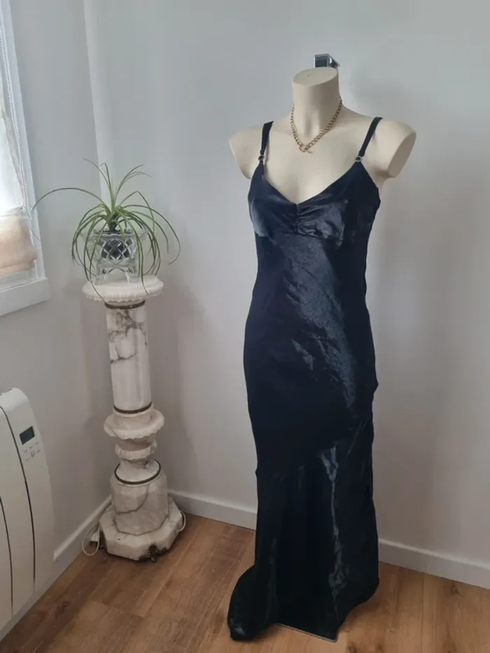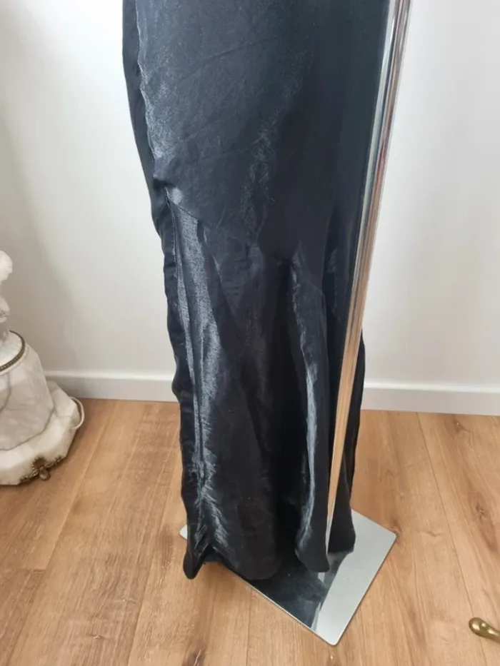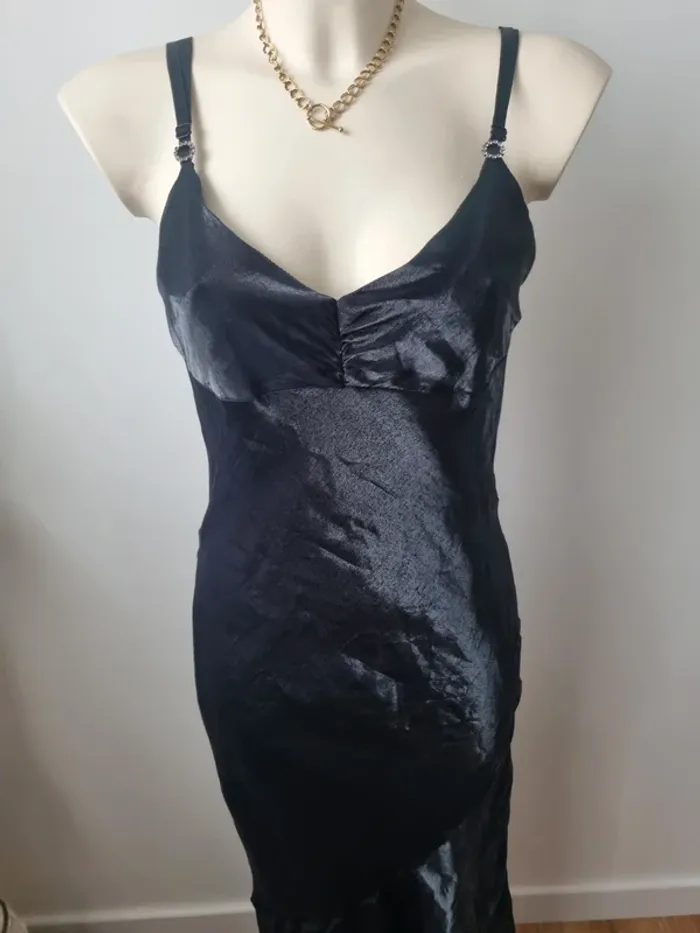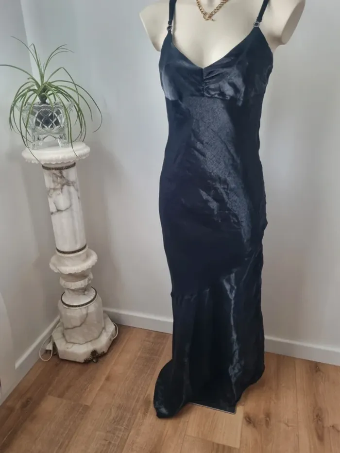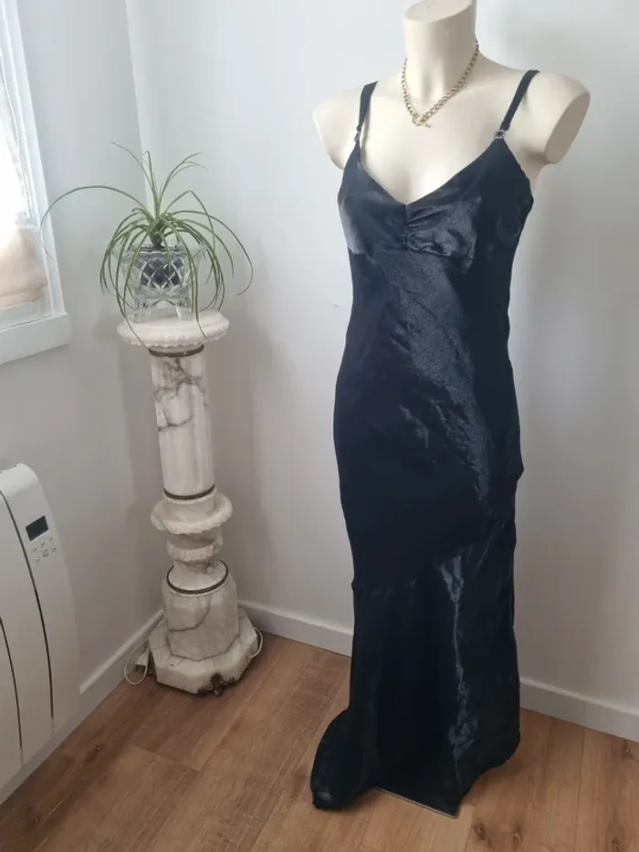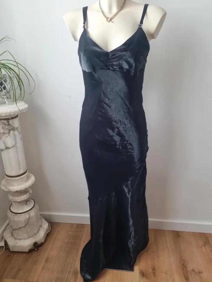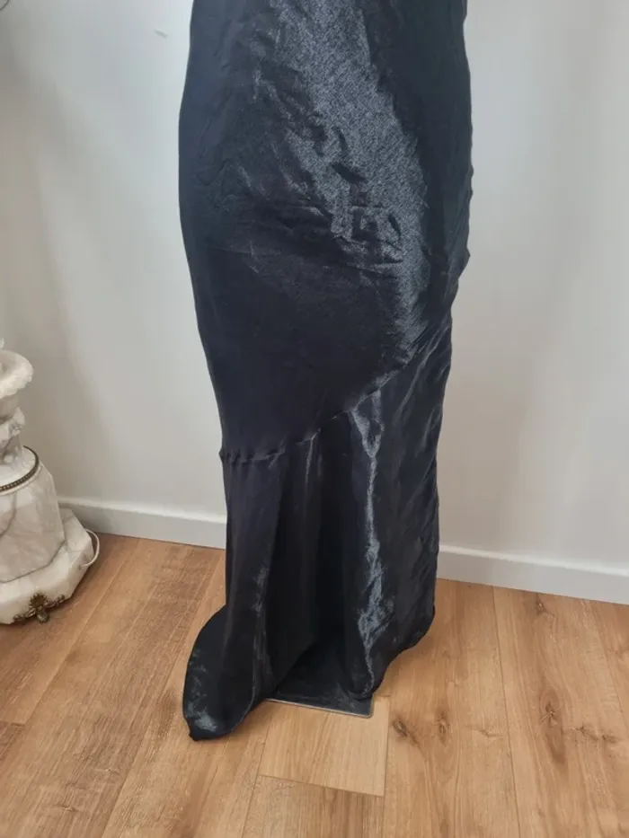 Magnifique robe longue en satin noir. En parfait état. Strass sur les bretelles. Évasé en cascade. Plus longue d'un côté que de l'autre, asymétrique. Made in France. Indiqué taille 40, L Vérifiez les dimensions : ⤵️ Dimensions: - Longueur: 145 cm (sans compter les bretelles qui se règle) - Largeur taille: 40 cm - Largeur aiselle: 38 cm