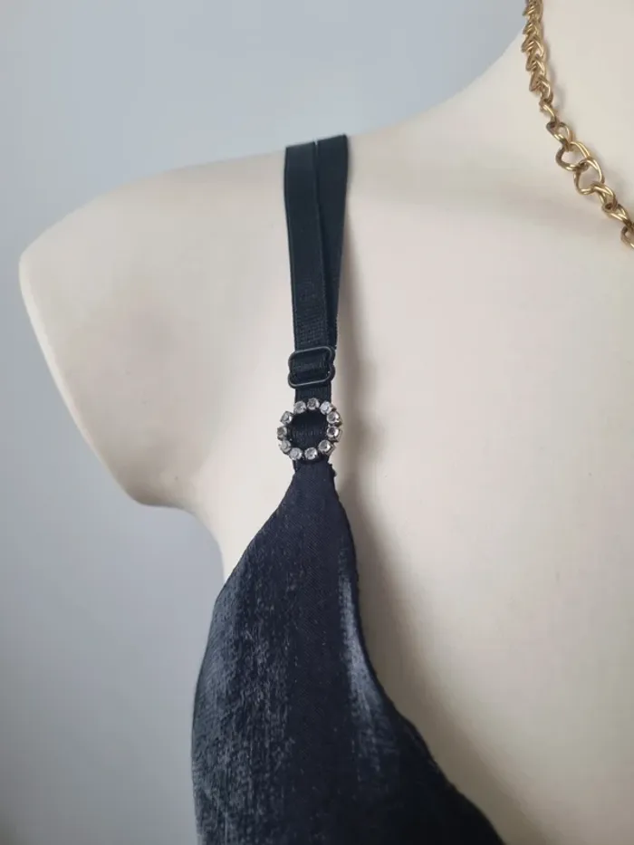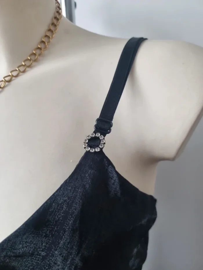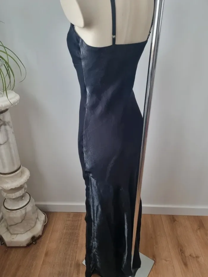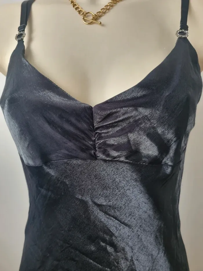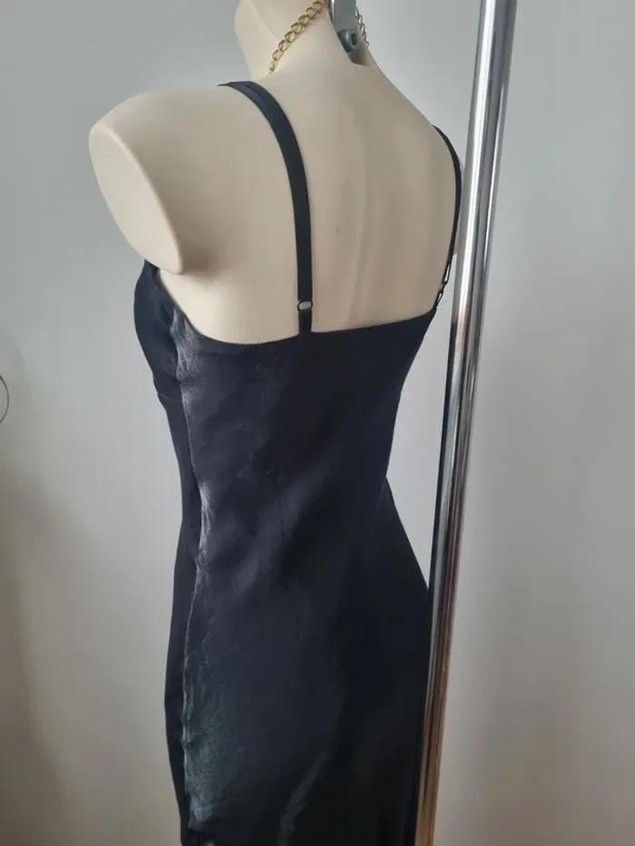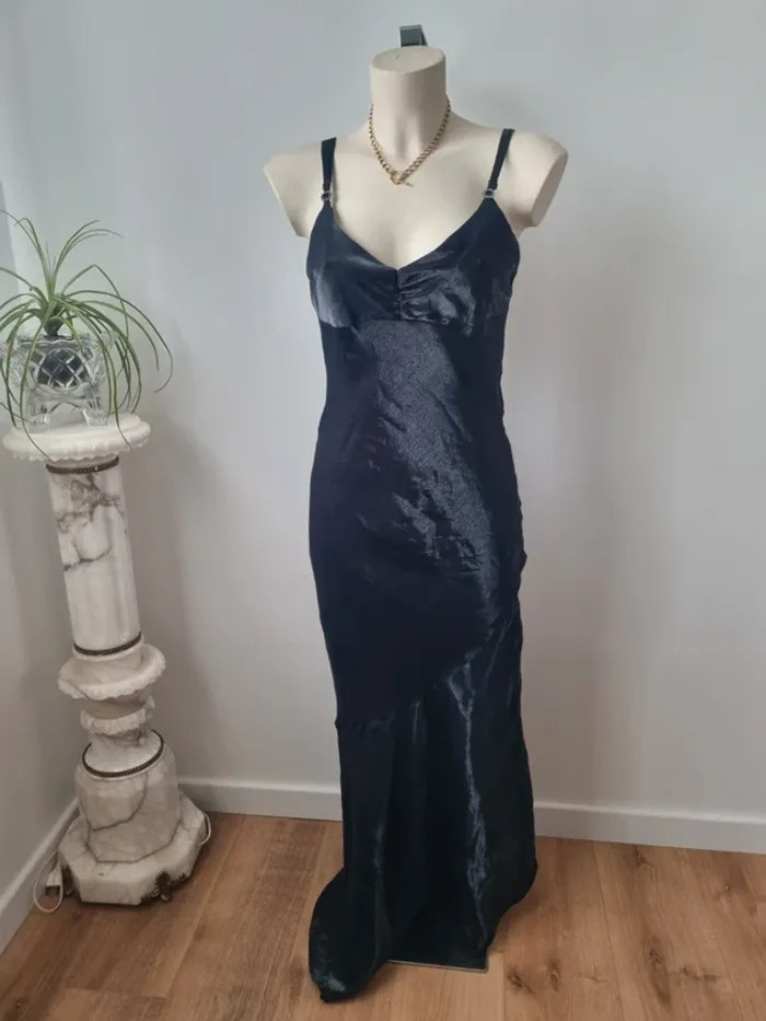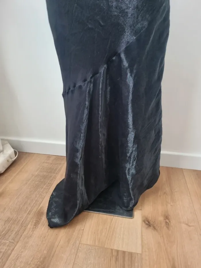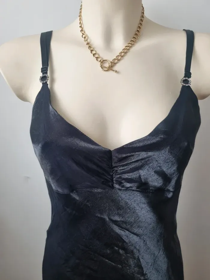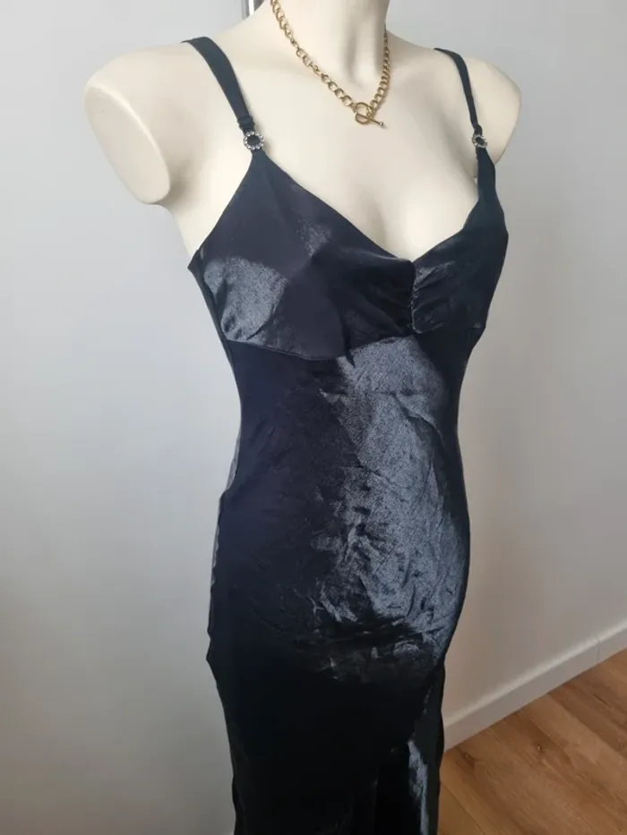 Magnifique robe longue en satin noir. En parfait état. Strass sur les bretelles. Évasé en cascade. Plus longue d'un côté que de l'autre, asymétrique. Made in France. Indiqué taille 40, L Vérifiez les dimensions : ⤵️ Dimensions: - Longueur: 145 cm (sans compter les bretelles qui se règle) - Largeur taille: 40 cm - Largeur aiselle: 38 cm