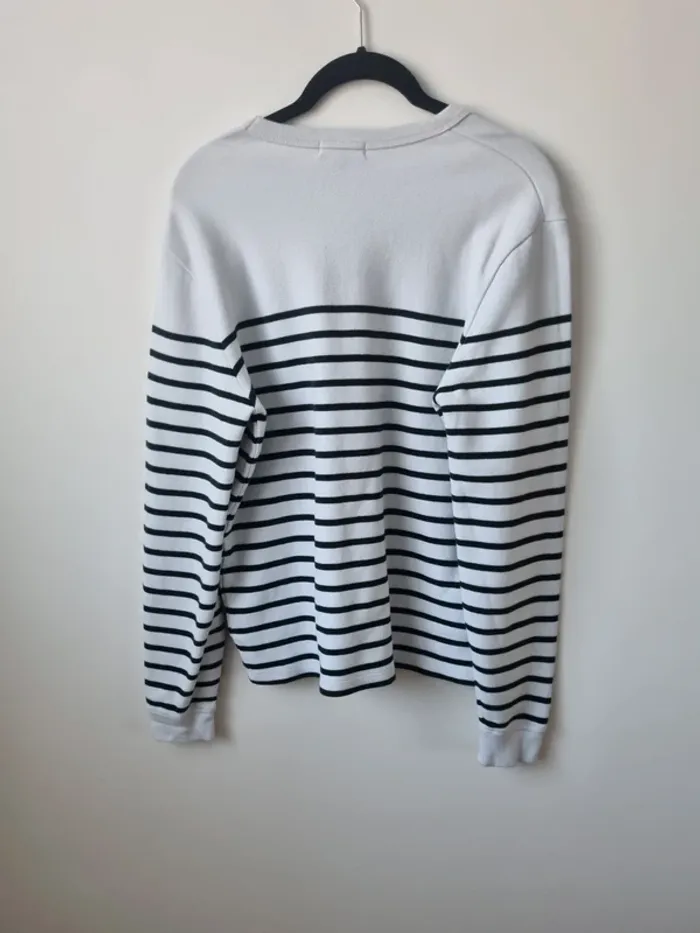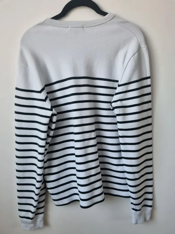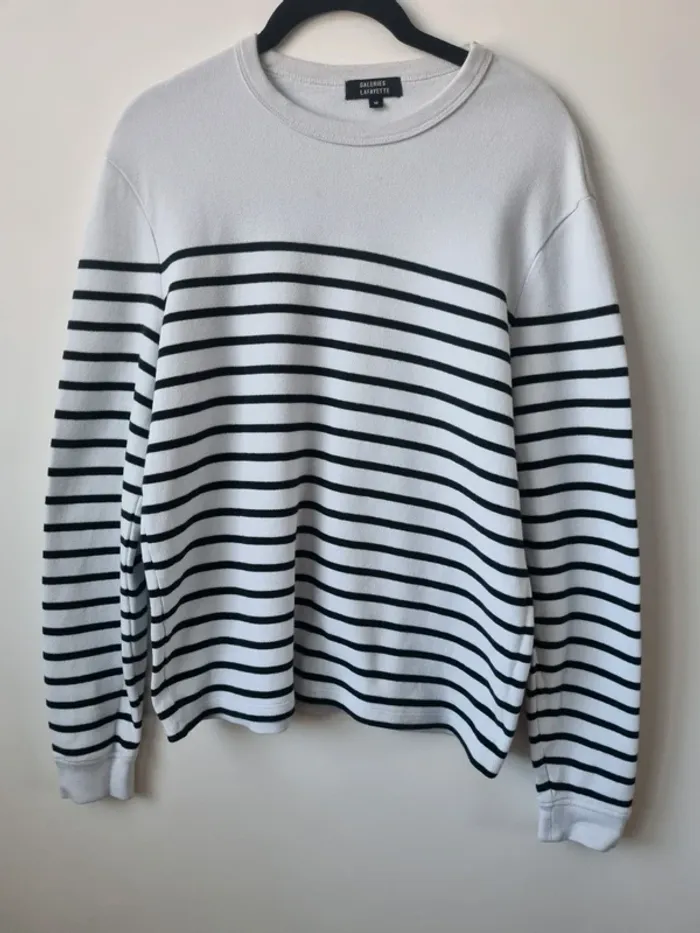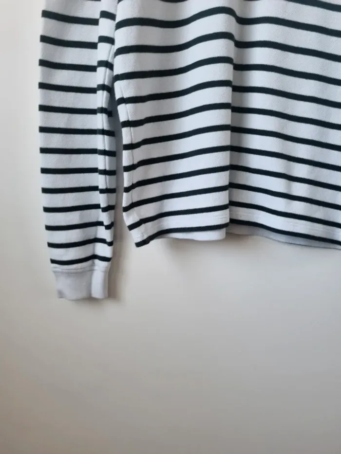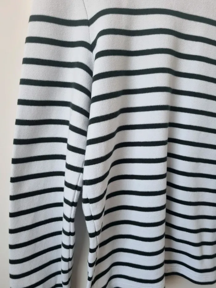 Magnifique marinière Galeries Lafayette 100 % coton Couleurs : blanc avec des rayures vert foncé Un basic dans une garde robe En parfait état Taille M Dimensions : - Largeur épaules : 48 cm - Longueur dos : 61 cm - Largeur aiselles : 50 cm - Largeur taille : 50 cm