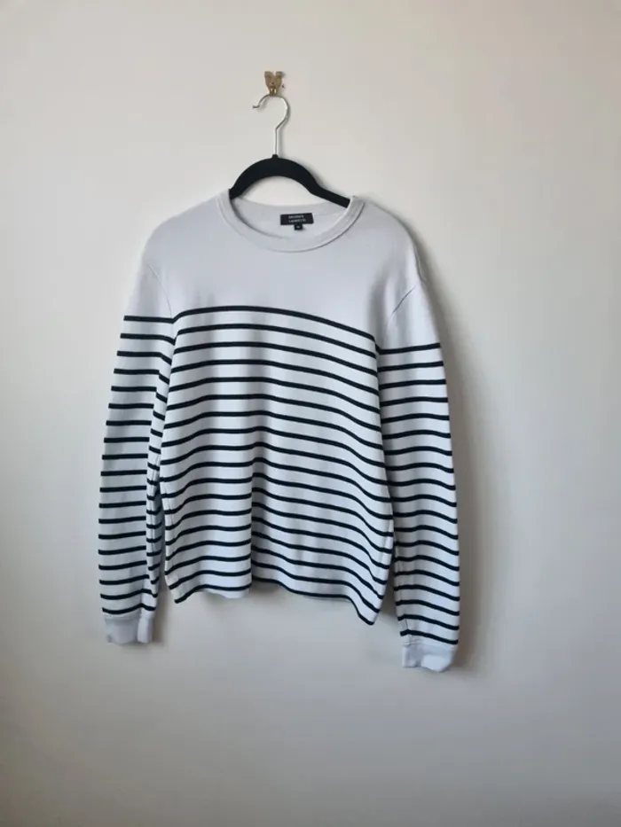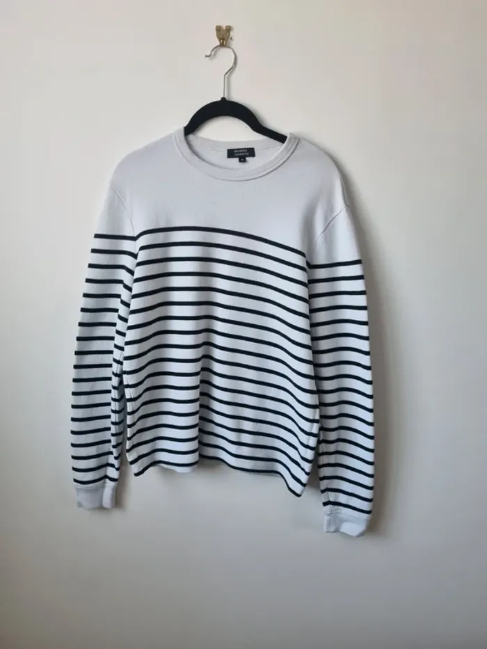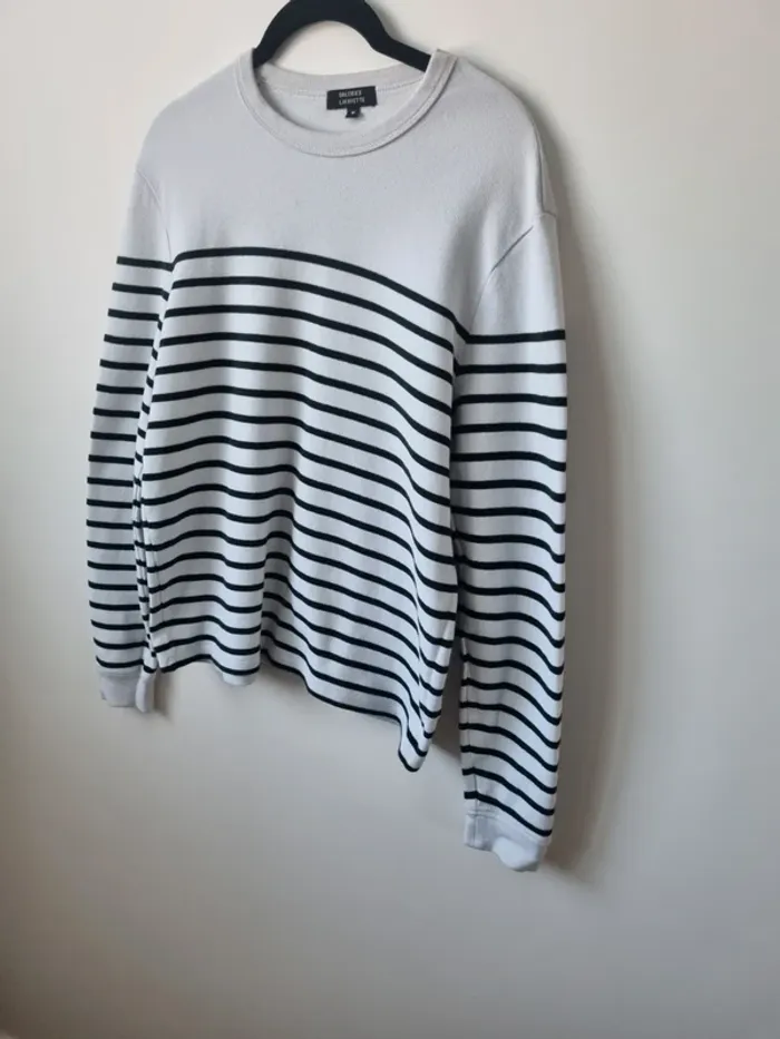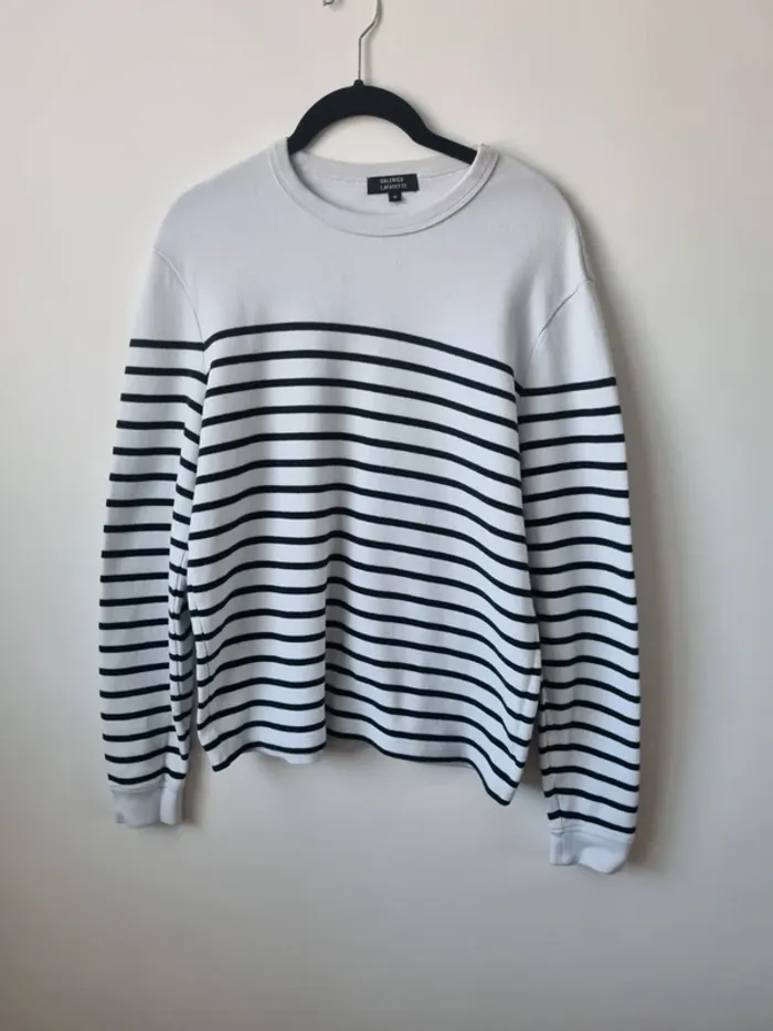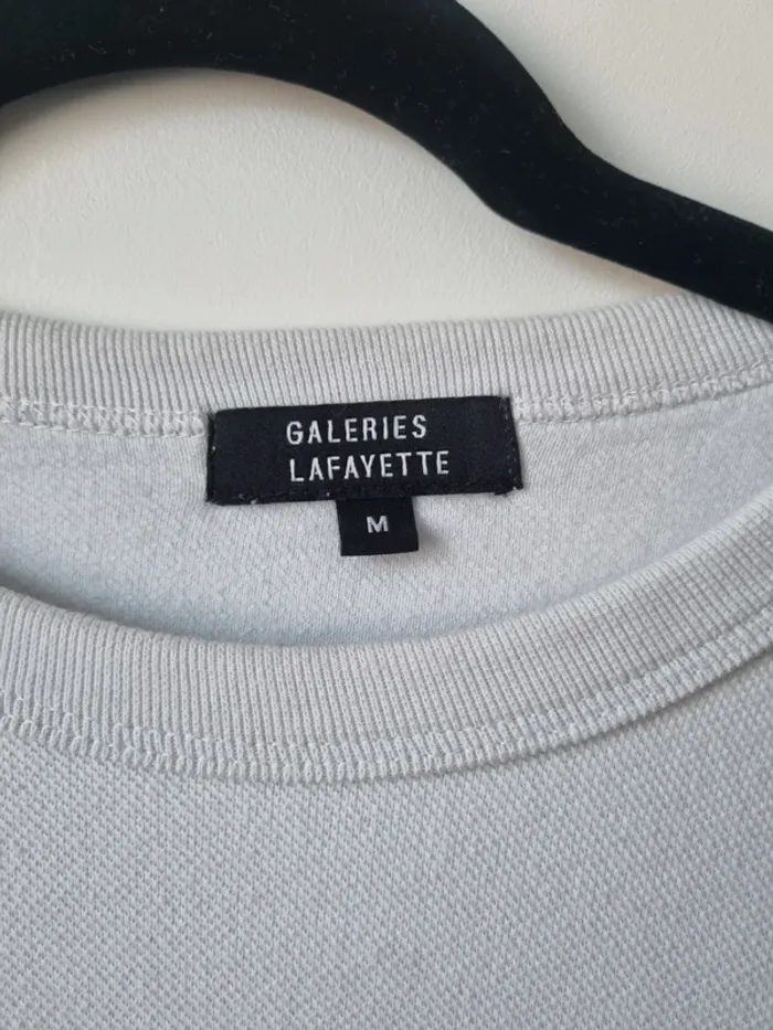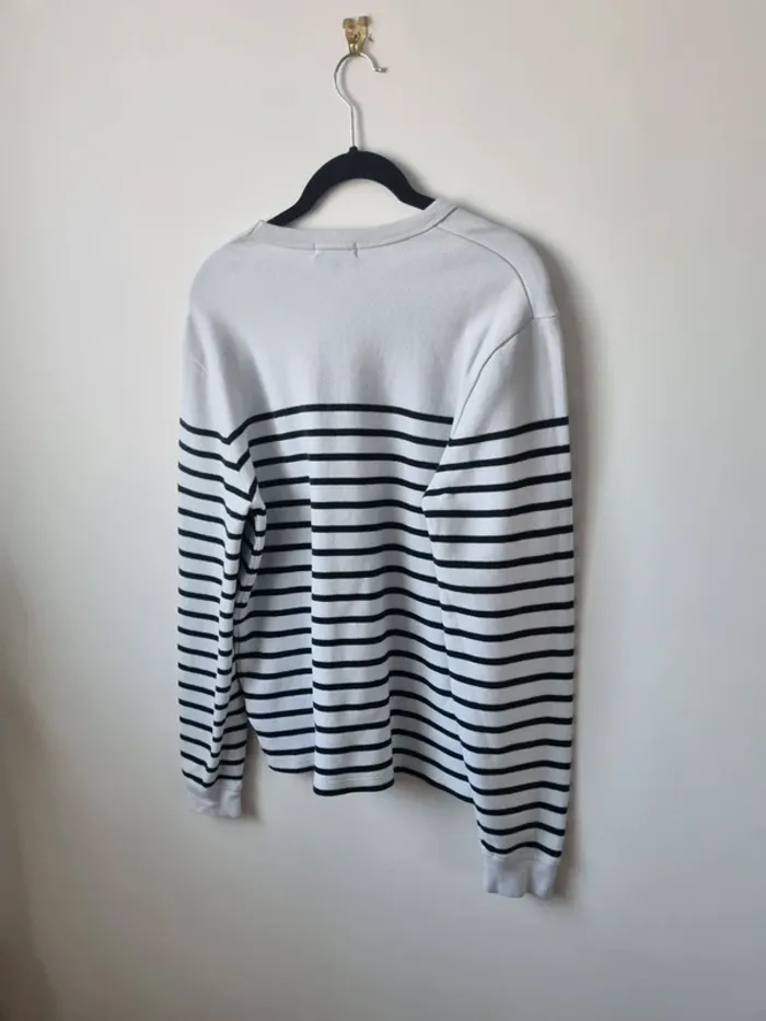 Magnifique marinière Galeries Lafayette 100 % coton Couleurs : blanc avec des rayures vert foncé Un basic dans une garde robe En parfait état Taille M Dimensions : - Largeur épaules : 48 cm - Longueur dos : 61 cm - Largeur aiselles : 50 cm - Largeur taille : 50 cm