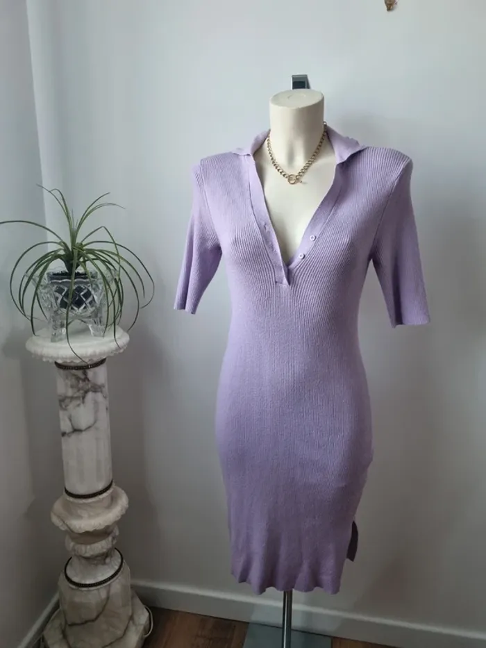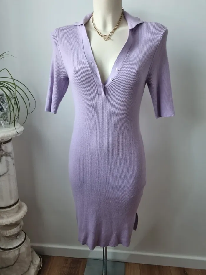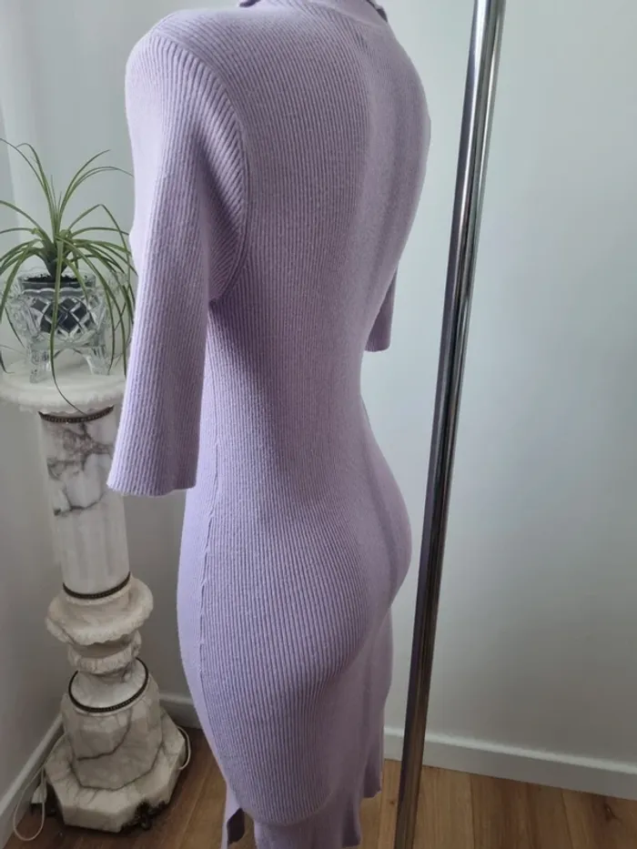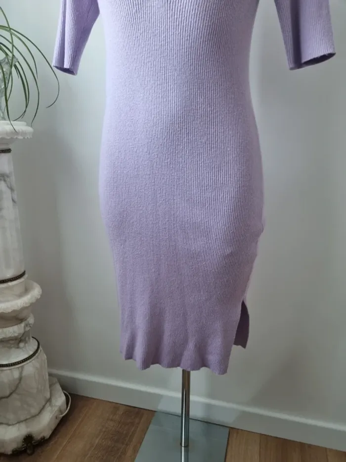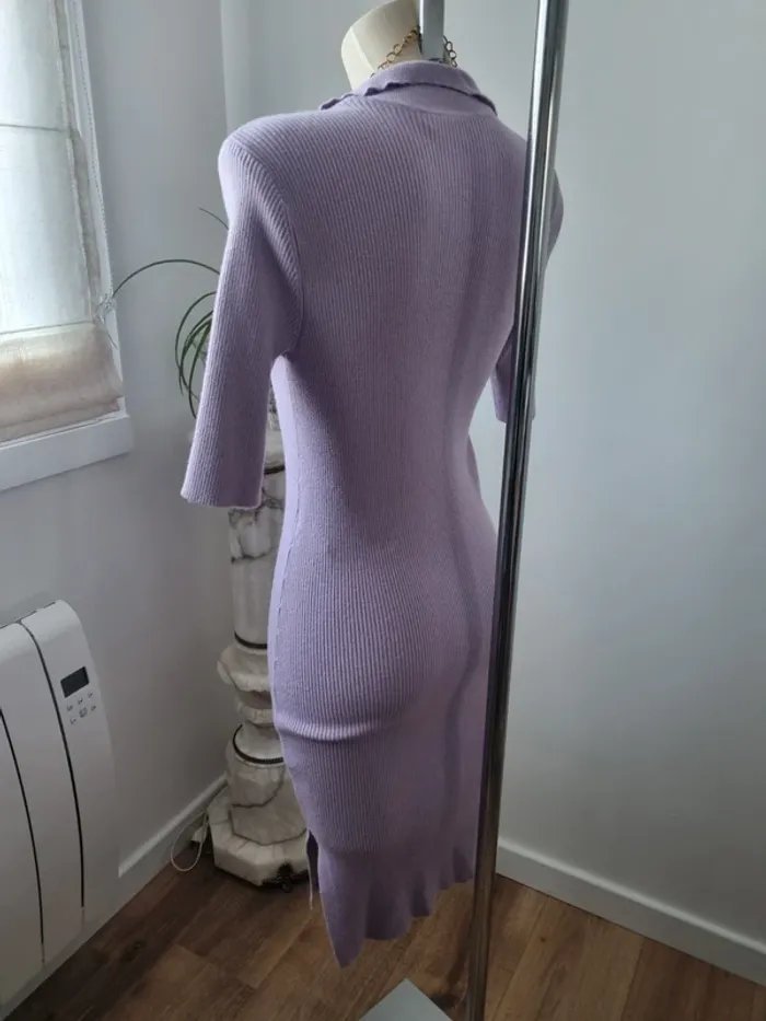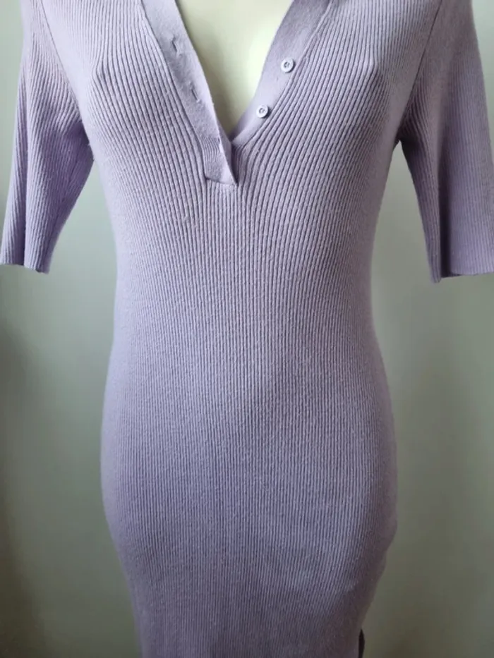 Magnifique robe longue en maille couleurs lilas En parfait état Fente sur le côté Elle est moulante Col en V avec 3 boutons Manche 3/4 Marque : Noisy May Elle est élastique Matières : - 50 % viscose - 26 % Nylon - 24 % polyester Taille M Dimensions : - Largeur épaules : 52 cm - Largeur taille : 45 cm - Largeur aiselles : 40 cm - Longueur dos : 110 cm