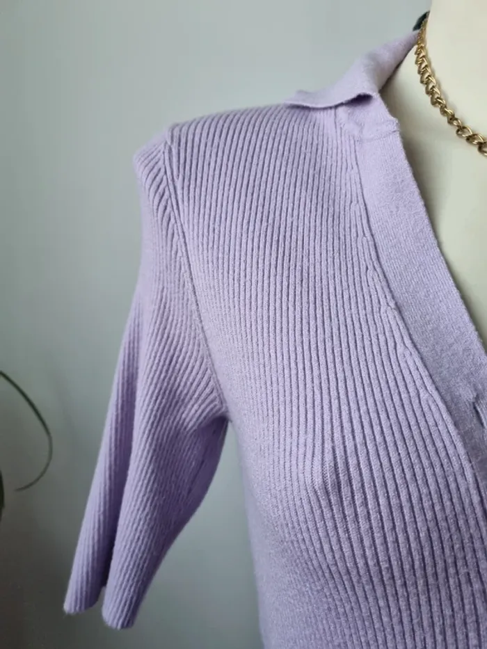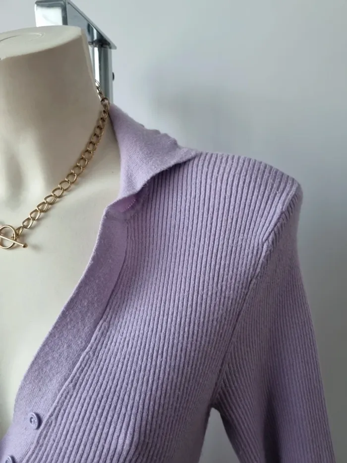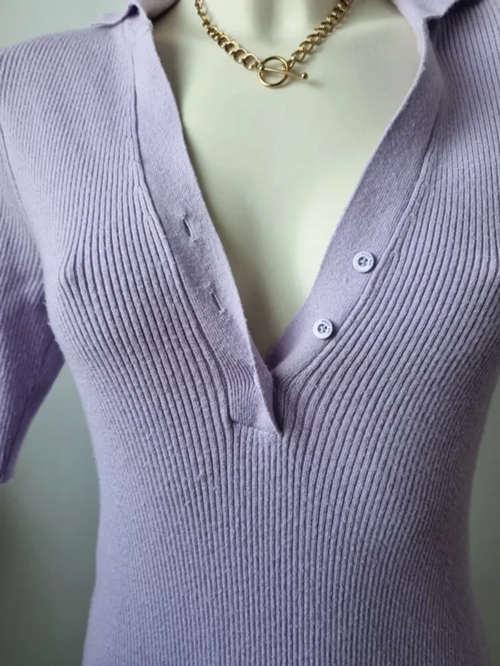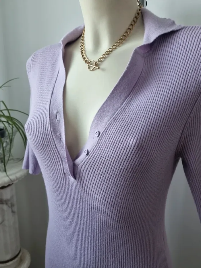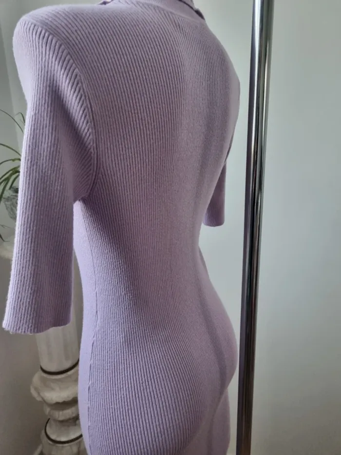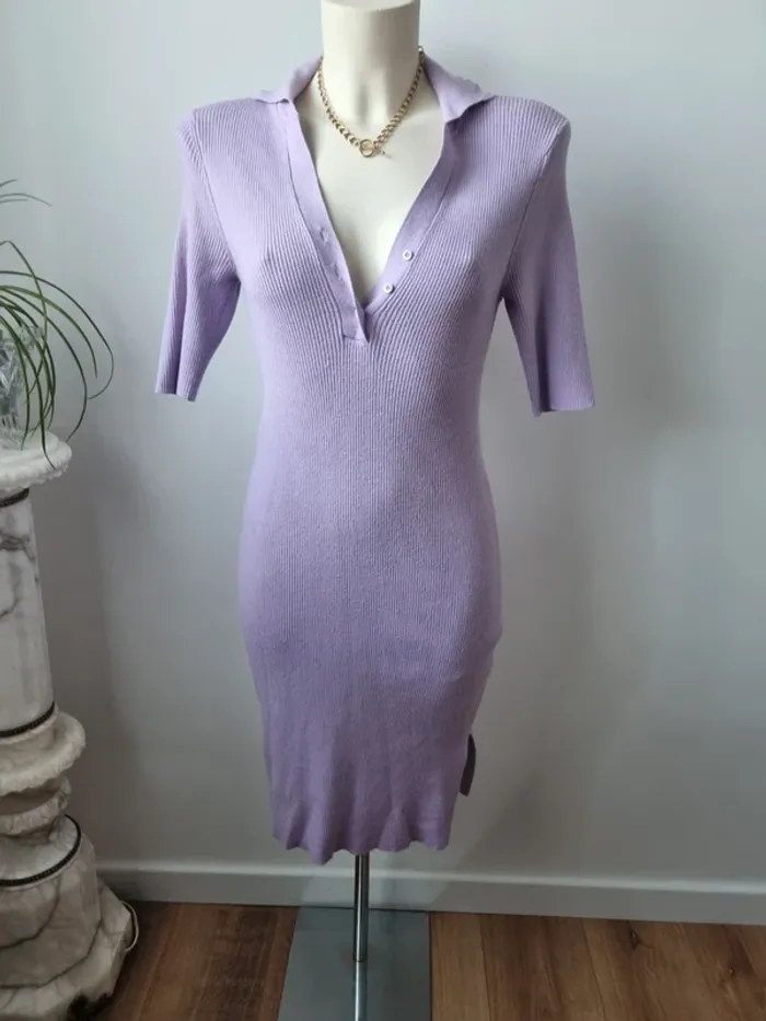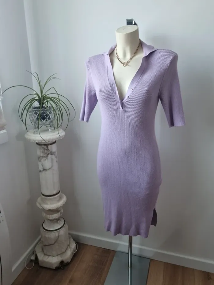 Magnifique robe longue en maille couleurs lilas En parfait état Fente sur le côté Elle est moulante Col en V avec 3 boutons Manche 3/4 Marque : Noisy May Elle est élastique Matières : - 50 % viscose - 26 % Nylon - 24 % polyester Taille M Dimensions : - Largeur épaules : 52 cm - Largeur taille : 45 cm - Largeur aiselles : 40 cm - Longueur dos : 110 cm