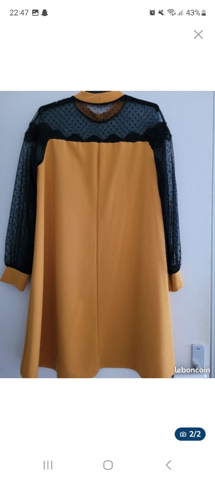 Je vends cette trés jolie robe pour femme de couleur moutarde et détails dentelle noir.Elle n'est pas transparente.Je mesure 1m60 et elle m'arrive quelques centimétres au dessous des genoux.Elle est de TU. De matiére:65%viscose et 35%polyester. Trés peu porté,elle reste en excellent état👌 Cette robe est idéal pour les fétes de fin d'années😉