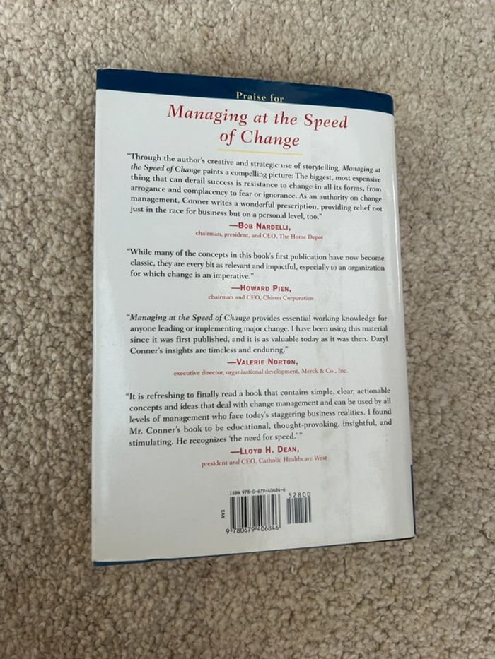 Livre grand format avec couverture rigide : Managing at the speed of change, How resilient managers succeed ans prosper where others fail de Daryl R. Conner, updated with new preface - English book Comme neuf This classic, newly updated, is an indispensable source for anyone–from mid-level managers to CEOs–who must execute key business initiatives quickly and effectively. Once groundbreaking and now time-honored, Managing at the Speed of Change has helped countless business leaders learn how to orchestrate transitions vital to their organizations’ success. Rather than focusing on what to change, this book’s aim is far more valuable: It shows readers how to change. Daryl R. Conner, founder and chairman of the consulting firm Conner Partners, is a leading expert on change management. He has served as “change doctor” for clients that include non-profit enterprises, government agencies and administrations, and Fortune 500 companies in an array of industries such as Abbott Laboratories, PepsiCo, American Express, Catholic Healthcare West, JPMorgan Chase, and the U.S. Navy. Based on Conner’s long-term research and his decades of consulting experience, Managing at the Speed of Change uses simple, easy-to-understand language and elegant visuals to explore the dynamics of change, and in doing so, teaches readers (...) In this pioneering book, updated for the twenty-first century, Conner demonstrates how both individuals and organizations can develop the capacity not only to endure change but to thrive on it. Sommaire en photo 290 pages 2006 Random House Excellent état maison non fumeur !!! Pas de vinted go et UPS pour moins de 10€ !!! Book in English - libro en iglès Pour découvrir mes nombreux autres livres à vendre, faire des lots et bénéficier de réduction automatique, cliquez sur #Athilielivre #Athiliedocumentaire #Athiliereference #Athiliesociété