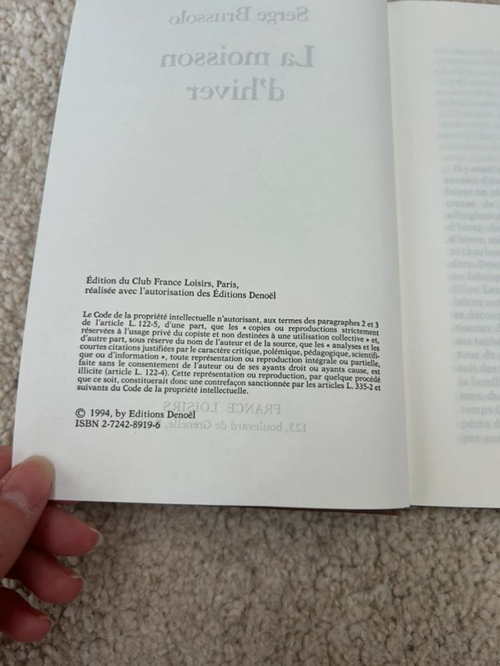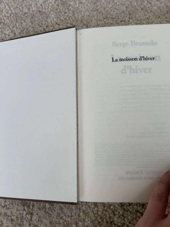 Livre grand format avec couverture rigide : la moisson d’hiver de Serge Brussolo thème : enquête, secret, rural, guerre mondiale, suspense, famille Dans les derniers mois de la Seconde Guerre mondiale, Julien, exilé depuis cinq ans au fond d'un pensionnat, apprend que son grand-père est mort dans d'étranges circonstances, lui laissant pour tout héritage les miettes de la propriété familiale, là-bas, en Normandie. Très vite, le jeune garçon prend conscience qu'un mystère ronge le passé de sa famille. Qui hante les bois aux alentours de la maison ? À qui appartient ce regard que l'enfant sent en permanence posé sur sa nuque ? Véritable thriller paysan, La moisson d'hiver nous plonge dans un monde d'intrigues où la jalousie obsessionnelle pousse chacun aux pires extrémités et où les secrets de famille prennent la dimension d'une énigme policière. 1995 404 pages France Loisirs Maison non fumeur Book novel in French - libro novela en francés - Franstalige roman - Romanzo in lingua francese - romance em língua francesa - Buch Roman auf Französisch Pour découvrir mes autres livres, faire des lots et bénéficier de réduction, cliquez sur #Athilielivre #Athilieroman #Athilieamour #Athiliehistoire #Athilieterroir #Athilieguerre #Athiliepolicier #AthilieWWII #Athiliefamille