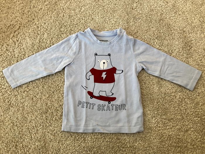 Tee shirt bleu clair manches longues skateur comme neuf garçon - 9 mois - vert baudet - photo numéro 1