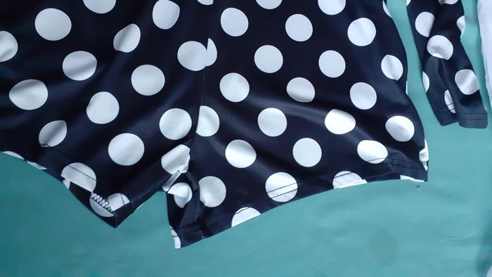 Vends un combishort manches longues sans bouton, encolure en V avec boutons devant, 95 % polyester, 5 % élasthanne, couleur noir à pois blancs, taille L. Longueur de l'épaule à la base : 71 cm Largeur aisselle à aisselle : 46 cm Largeur au niveau des hanches : 50 cm.